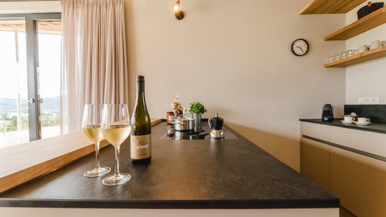 Der große Wohnraum mit gut ausgestatteter Küche, großem Esstisch und gemütlichem Sofa ist zentraler Platz der Wohnung.