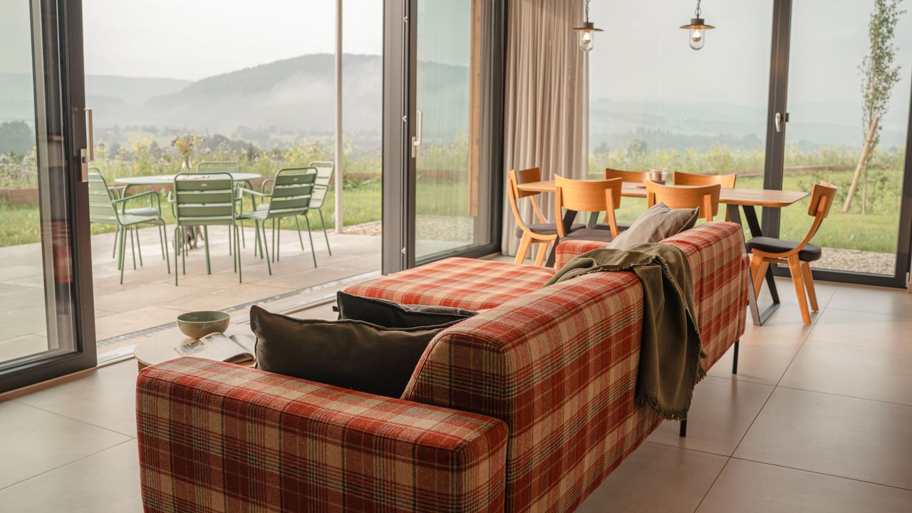 Bodentiefe Fenster zu zwei Seiten bieten einen unverbauten, weiten Blick in die Natur.
