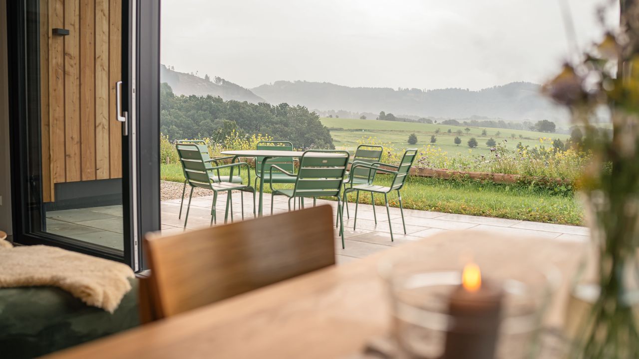 Was in den neuen Häusern ebenfalls nicht fehlen darf: die Terrasse an drei Seiten des Hauses. "Hinterm" Haus Richtung Südosten für viel Sonne, einem fantastischen Blick über die Sauerländer Berge und absolute Ruhe. Auf der Westseite des Hauses für romantische Sonnenuntergänge und Blick auf Garten, Spielplätze und Stallungen.