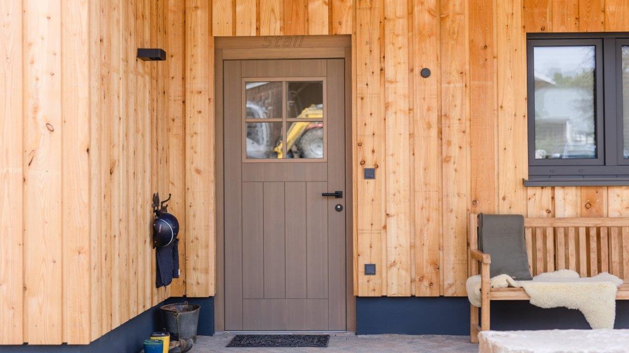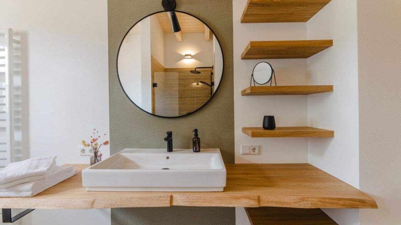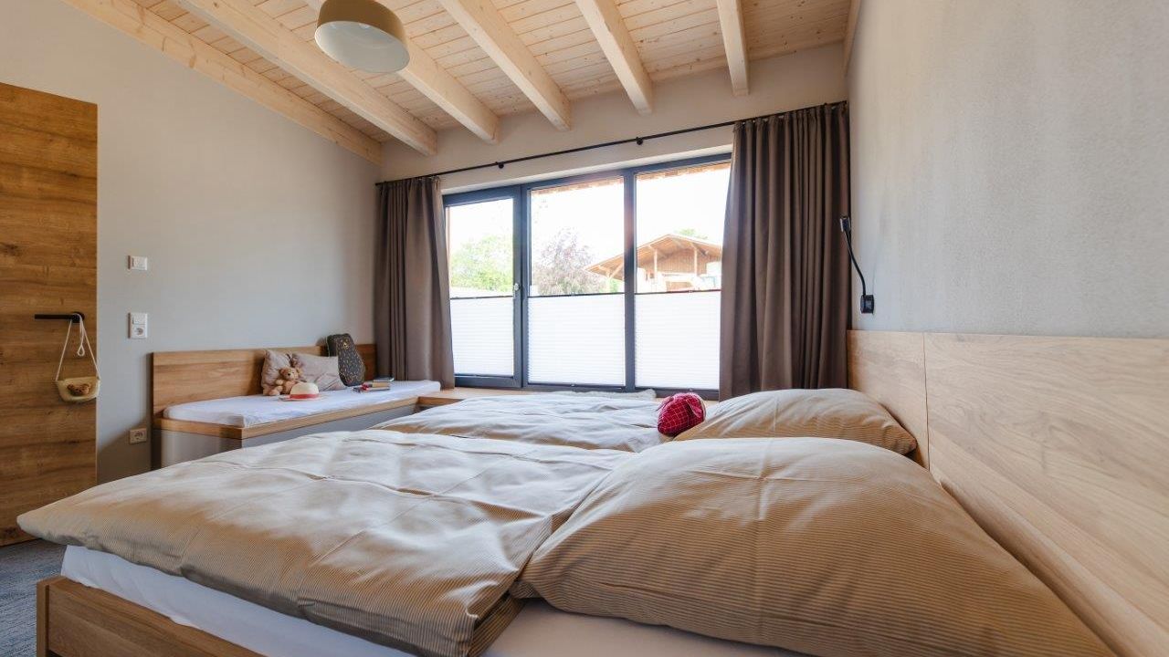Ebenerdig auf 110qm verteilt befinden sich zwei Schlafzimmer mit Doppelbetten und gemütlicher Kinderkoje. Platz für ein Babybett gibt es außerdem. Bodentiefe Fenster in einem der Schlafzimmer sorgen für einen fantastischen Blick auf tolle Sonnenaufgänge über den Sauerländer Bergen. Eine tiefe Fensterbank mit Blick zum Stall und in den Garten sorgt im zweiten Schlafzimmer für gemütliche Stunden.