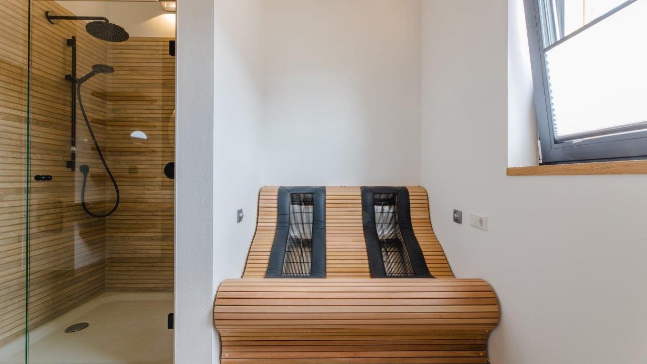 Eines der Badezimmer ist zusätzlich ausgestattet mit einer Infrarotliege und Wickeltisch.