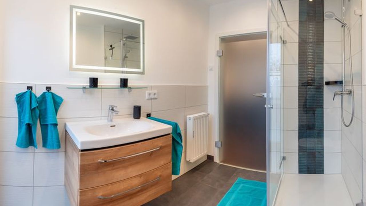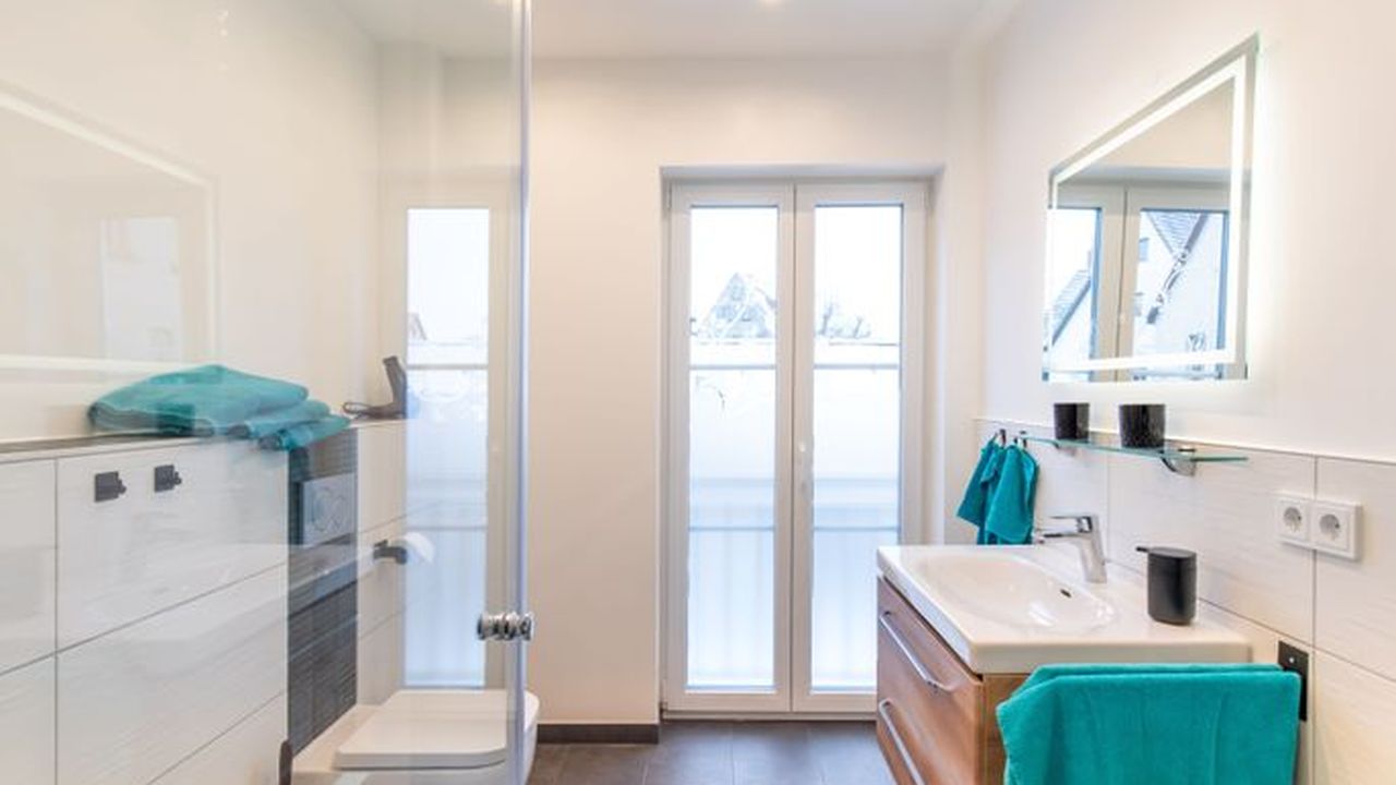 Aus vielen neuen Wänden im Inneren entstanden schließlich 7 helle Appartements. Helle Fliesen und ein farblicher Akzent, ein Boden in Holzoptik, je ein Doppelbett und