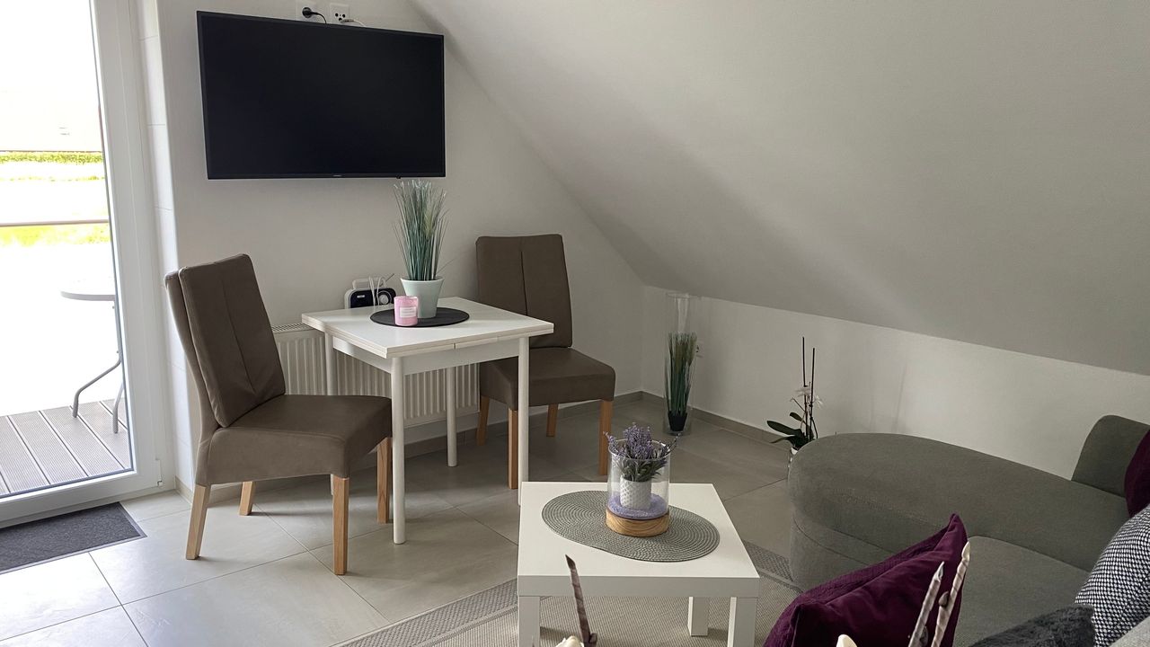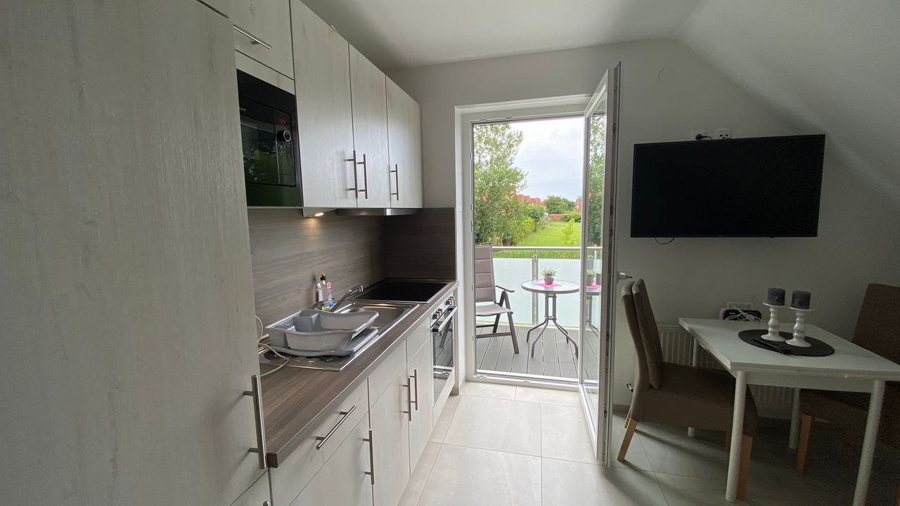 Die Wohnküche besteht aus einer gemütliche Sitzecke mit Schlafmöglichkeit für eine Personen, einem Farbfernseher sowie der Essecke für 3 Personen. Die Küche ist komplett ausgestattet mit E-Herd (Backofen und 4 Kochfelder), Kaffeemaschine, Toaster etc.