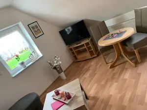 Die Wohnküche besteht aus einer gemütliche Sitzecke mit Schlafmöglichkeit für eine Personen, einem Farbfernseher sowie der Essecke für 3 Personen. Die Küche ist komplett ausgestattet mit E-Herd (Backofen und 4 Kochfelder), Kaffeemaschine, Toaster etc.