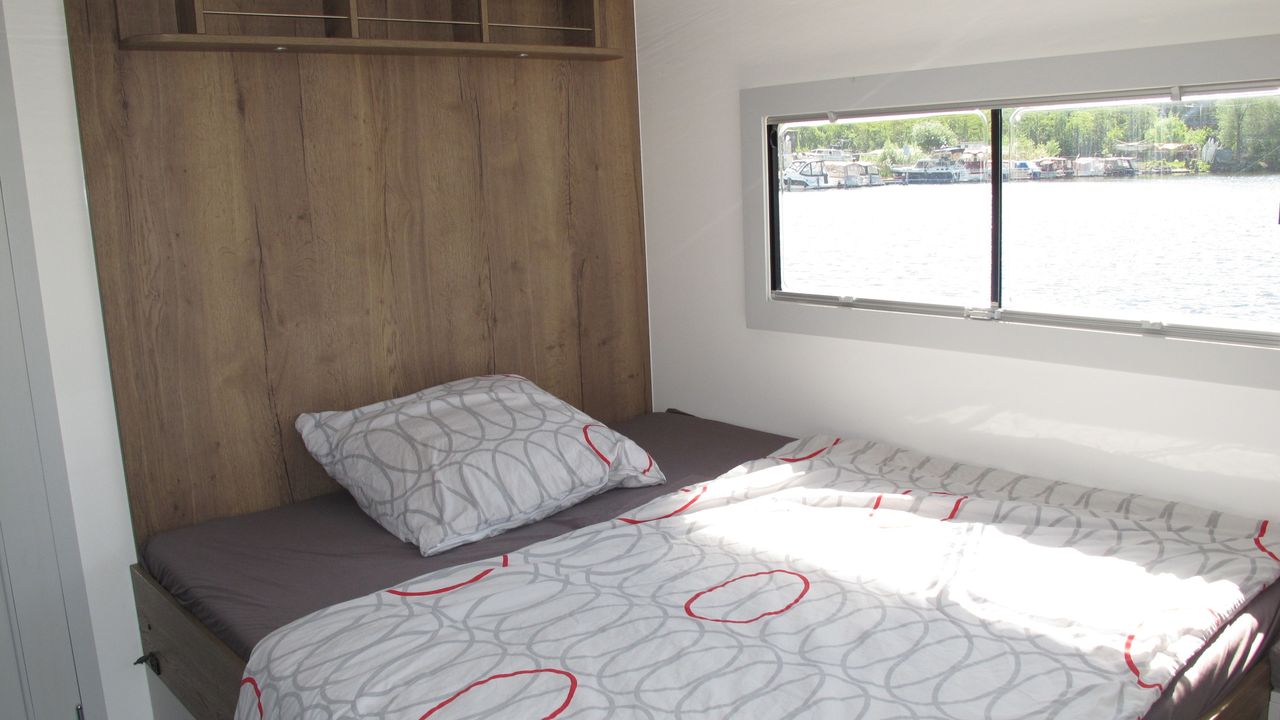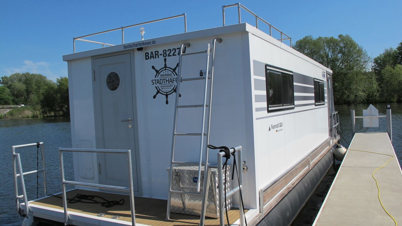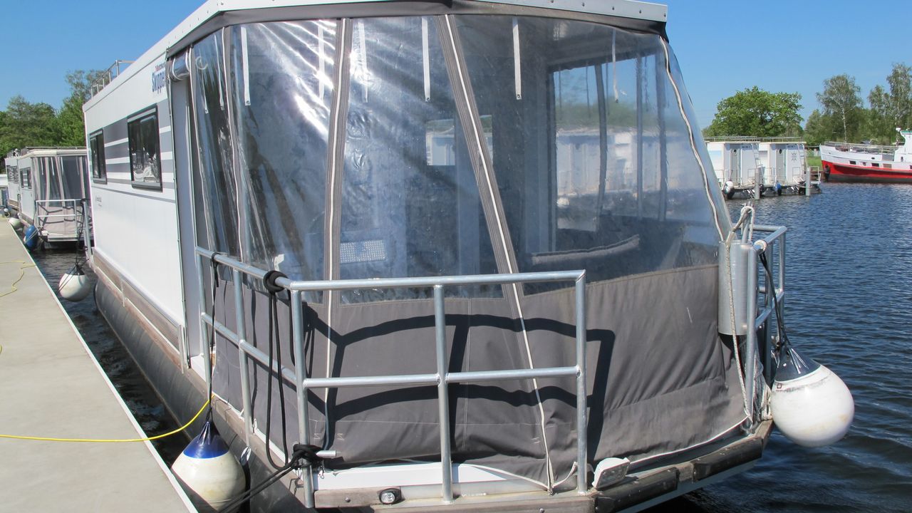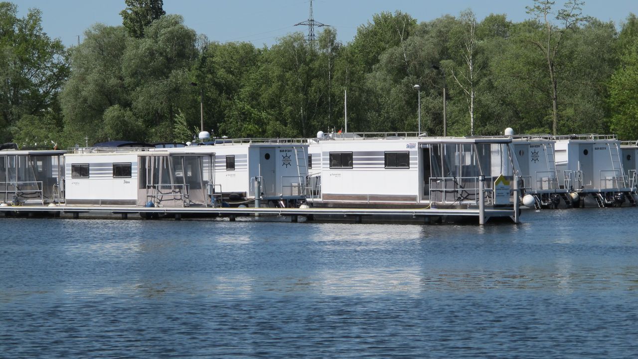 HAUSBOOT HANNA (HENN100) IN DER NÄHE VON BERLIN (20 km) UND MIT DIREKTER S-BAHN-ANBINDUNG, AUF DER HAVEL IN DER MARINA HENNIGSDORF; ideal auch als festliegendes Ferienhaus geeignet.Das Hausboot liegt in der Marina Hennigsdorf, ruhig und sonnig, nur ca. 500 m vom Ortszentrum. Kostenfreie Parkmöglichkeiten, ca. 200m entfernt; Zugang über Bootssteg direkt zum Hausboot. Das Hausboot HANNA (ca. 25 m² Wohnfläche) hat einen großen Führerstand (Wetter- und Sonnenschutz variabel einsetzbar) mit 2 kleinen Sofas und Fahrersitz. Von hier Zugang in Wohn-/Schlafraum mit bequemer Sitzgruppe, umbaubar in ein franz. Bett (Liegefläche 1,40 m x 2 m) und Küchenzeile (3 Flammen, Backofen, Wasserkocher). Schlafzimmer mit franz. Bett (Liegefläche 1,40 m x 2 m) mit Zugang zum Heck (Außenborder). Kleine Dusche/WC. Vom Heck Zugang über schmale und steile Außenleiter zu Sonnendeck mit Liegewiese (8 m²), sowie eine Badeleiter zum bequemen Ein- und Ausstieg ins Wasser.