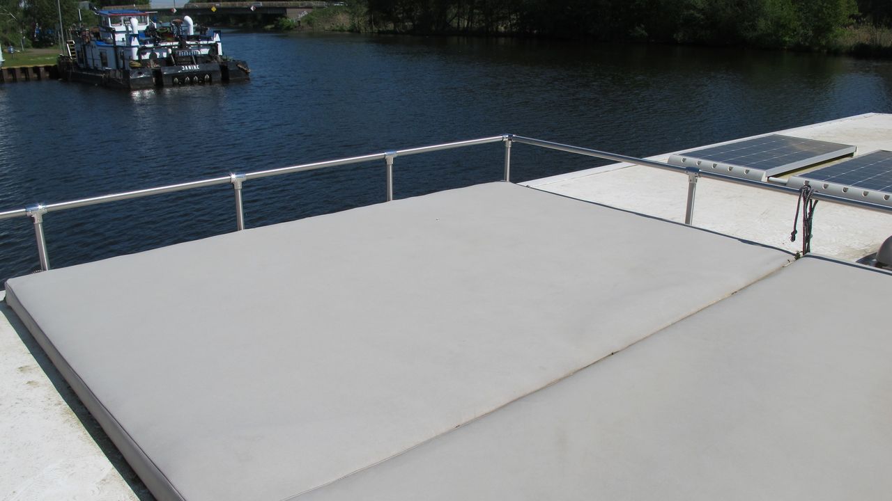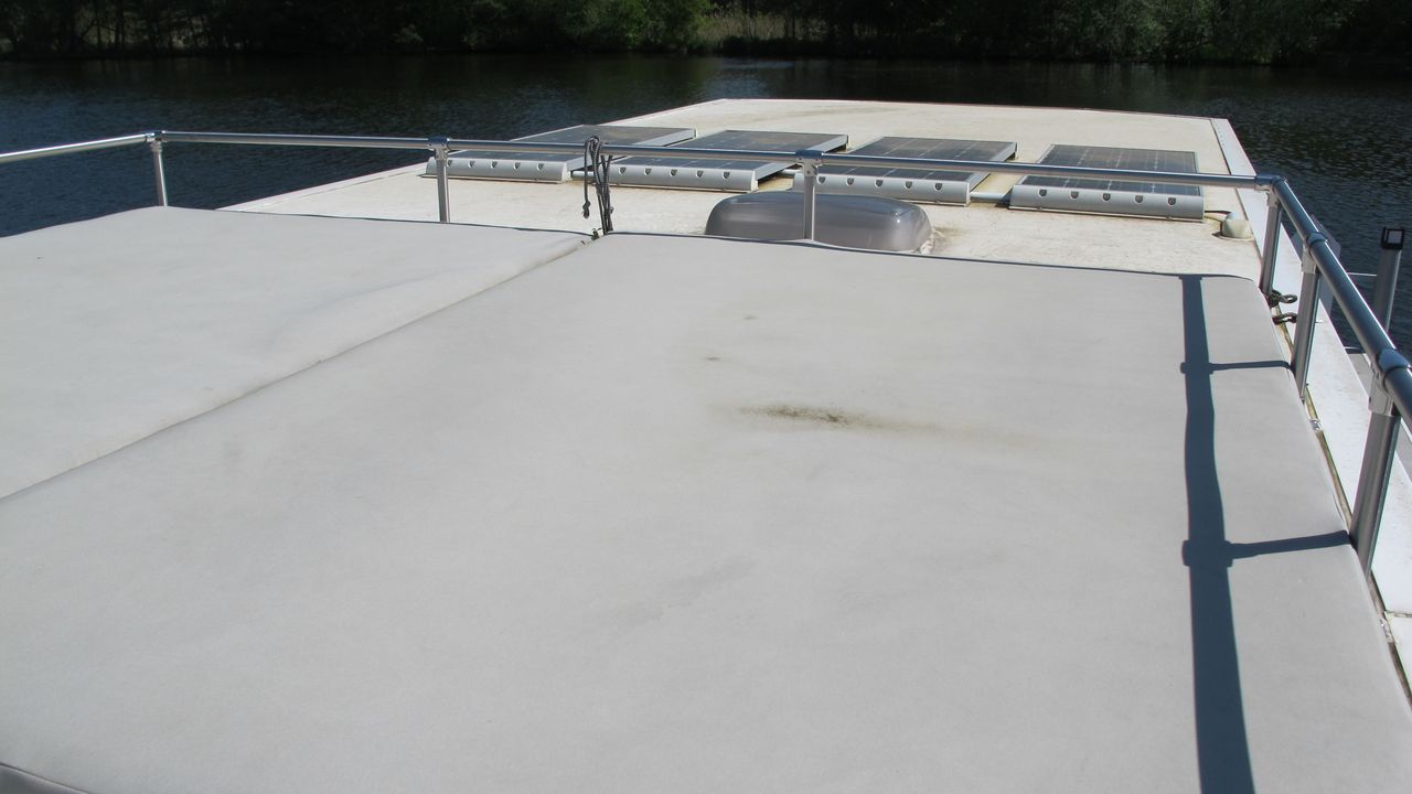 Großes Sonnendeck auf dem Dach des Hausbootes mit Liegewiese und niedrigem Geländer; Zugang über schmale und steile Außentreppe.WICHTIGE HINWEISE VORAB: