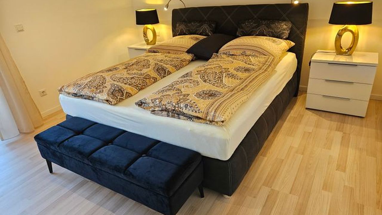- Boxspringbett (1,80m x 2m) mit Leseleuchten und Bettbank