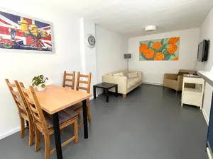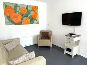 Treten Sie ein und fühlen Sie sich wie zu Hause in unserem Wohnzimmer mit einer bequemen Couch, perfekt für gemütliche Abende nach einem Tag am Strand. Die Küche ist mit einem Kühlschrank, einer Mikrowelle, einem Kaffeemaschine und einem Toaster ausgestattet, damit Sie sich morgens ein leckeres Frühstück zubereiten können, bevor Sie sich auf den Weg zum Strand machen.