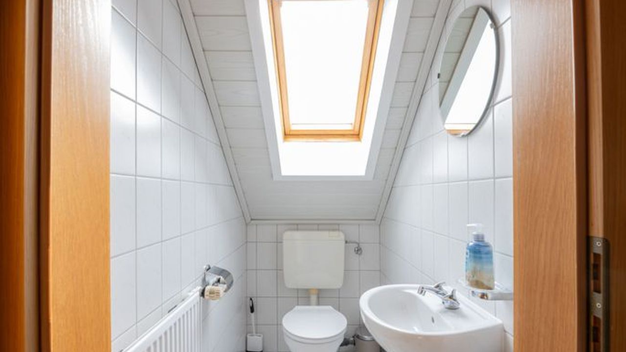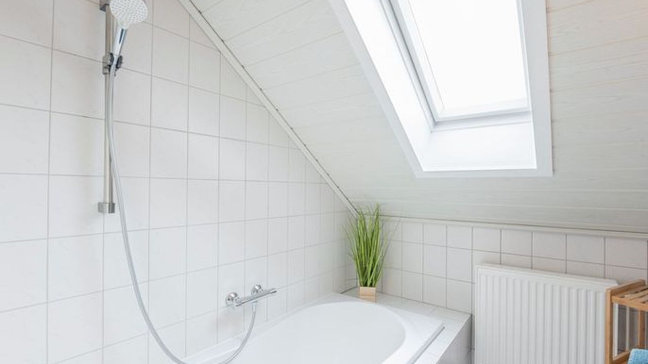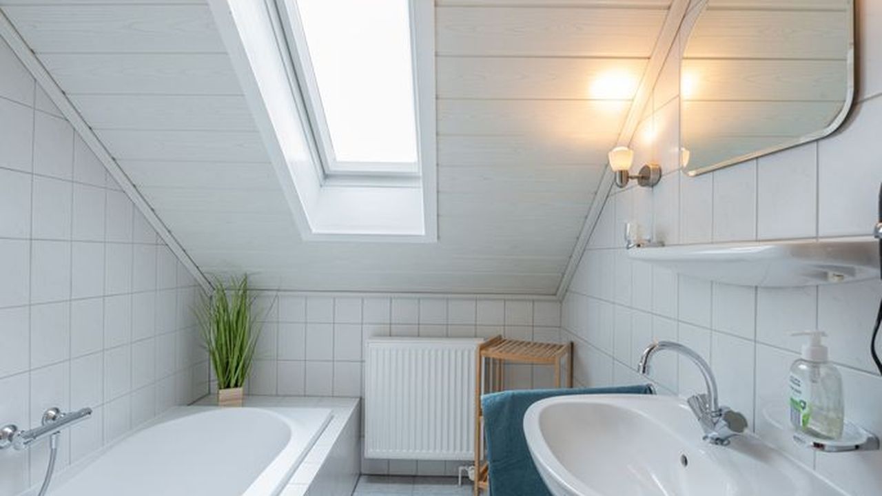 Die Unterkunft verfügt zudem über ein helles Tageslichtbad mit einer Badewanne inkl. Duschfunktion, Waschbecken und einem Föhn. Das WC befindet sich in einem separaten Raum.
