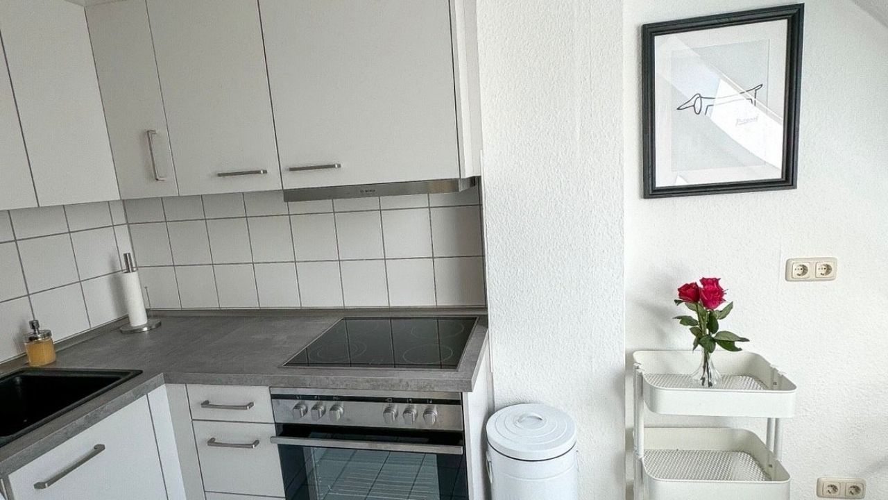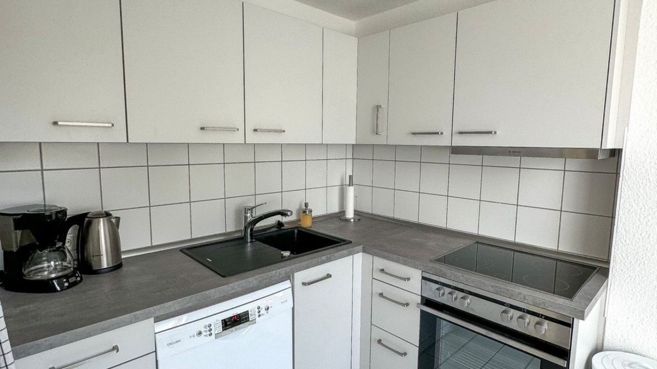 Die gut ausgestattete Küche besitzt unter anderem einen Kühlschrank, einen Herd zum Kochen und sogar eine Spülmaschine.