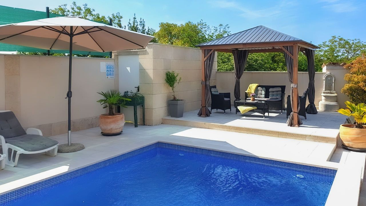 Mit privatem Swimmingpool, Sonnenliegen und Sonnenschirmen ist der Außenbereich ideal zum Entspannen und Genießen an der frischen Luft. Ein Grill und eine Terrasse laden zu langen Mahlzeiten im Freien ein, während ein separater überdachter Lounge-Bereich perfekt für abendliche Drinks ist.