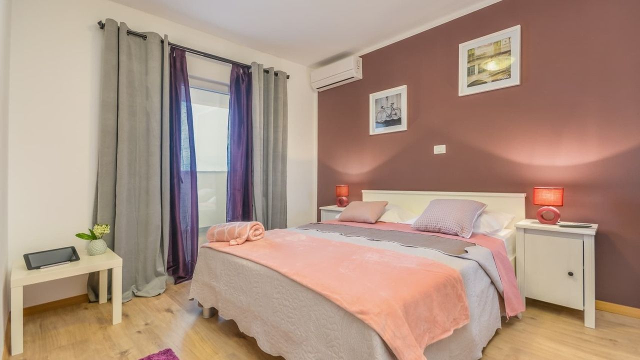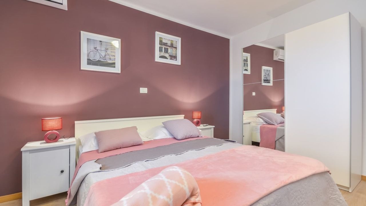 Schlafzimmer 3 – Doppelbett, Klimaanlage und Balkon mit Blick auf Dorf und Garten