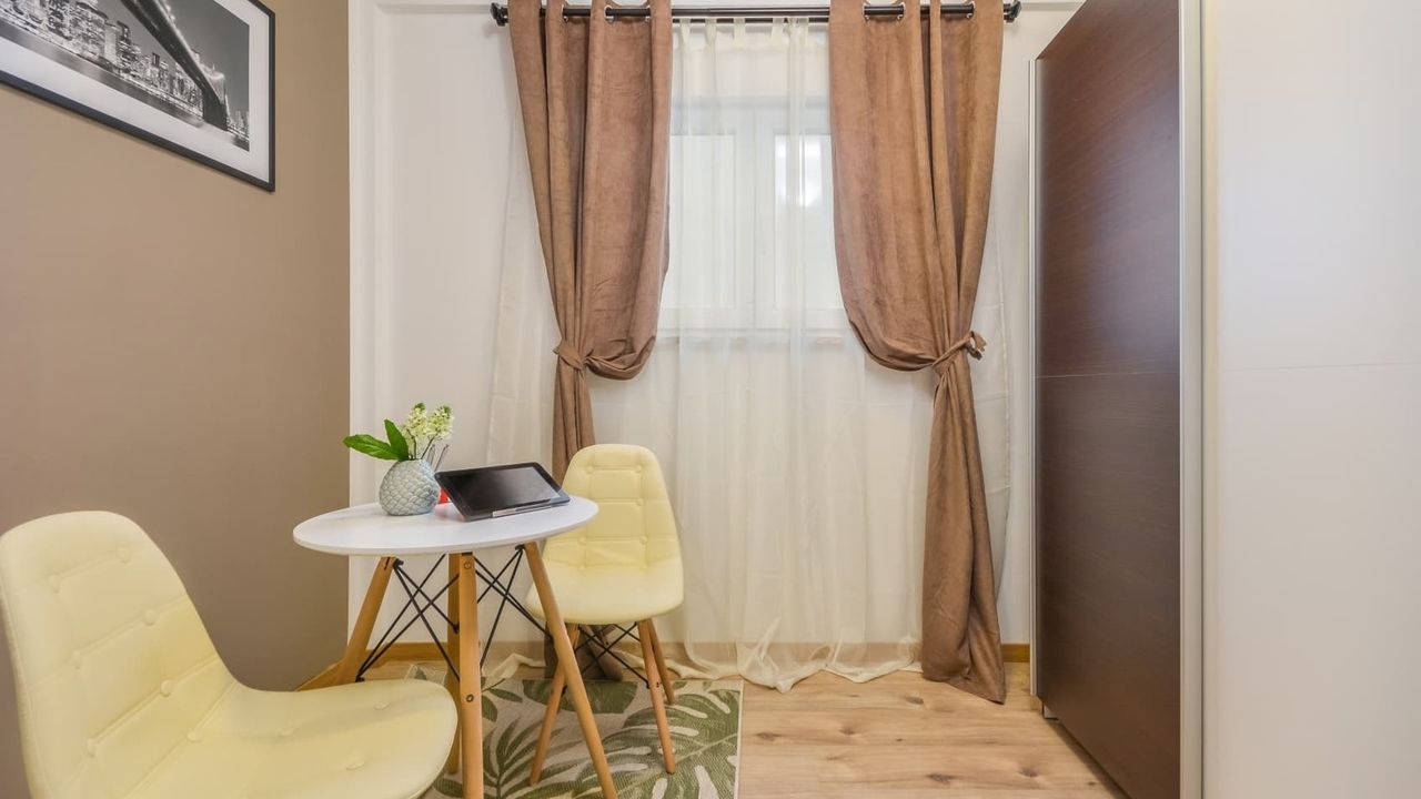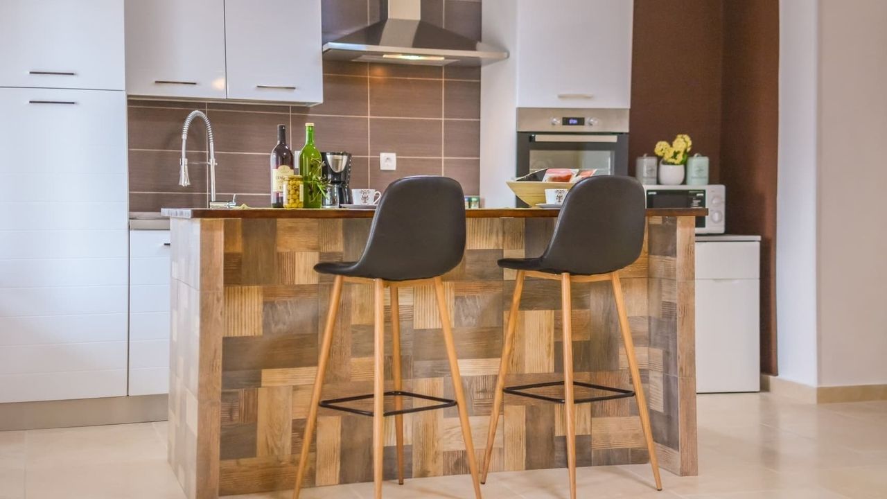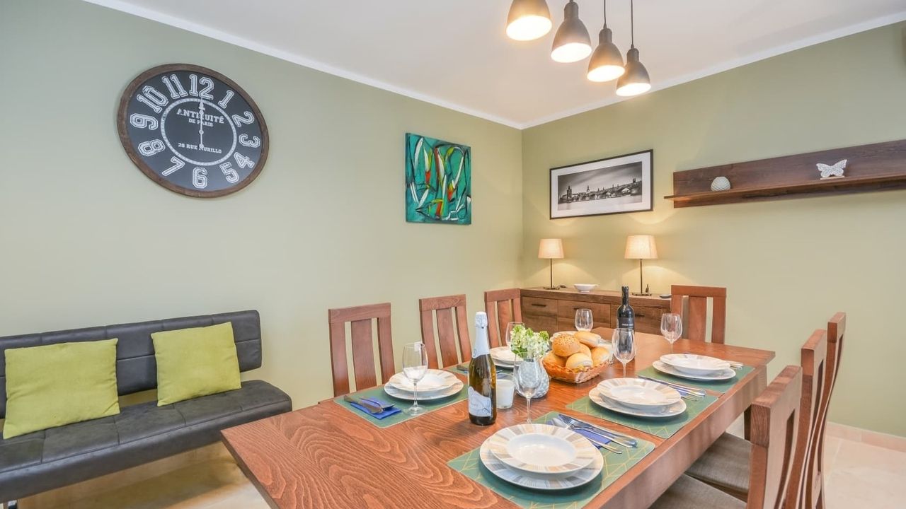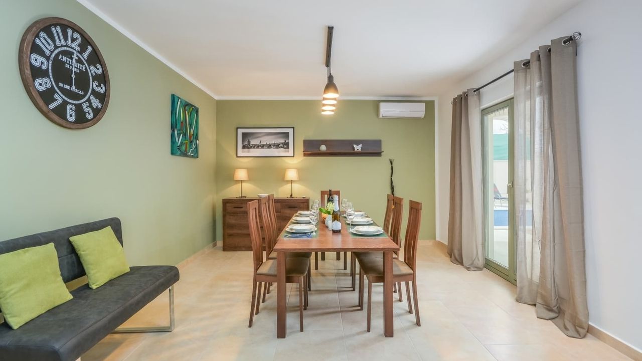 Der Essbereich bietet große Fenster mit Blick auf den Pool, während das gemütliche Wohnzimmer mit freiliegenden Steinwänden, einem bequemen Sofa und einem 65" SMART-TV mit kostenlosem Netflix und Prime Video überzeugt.