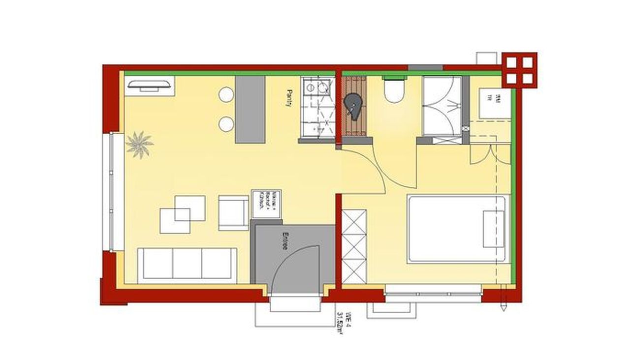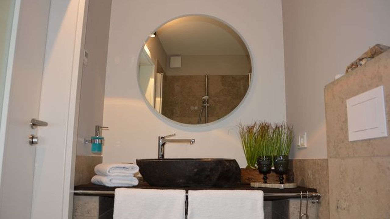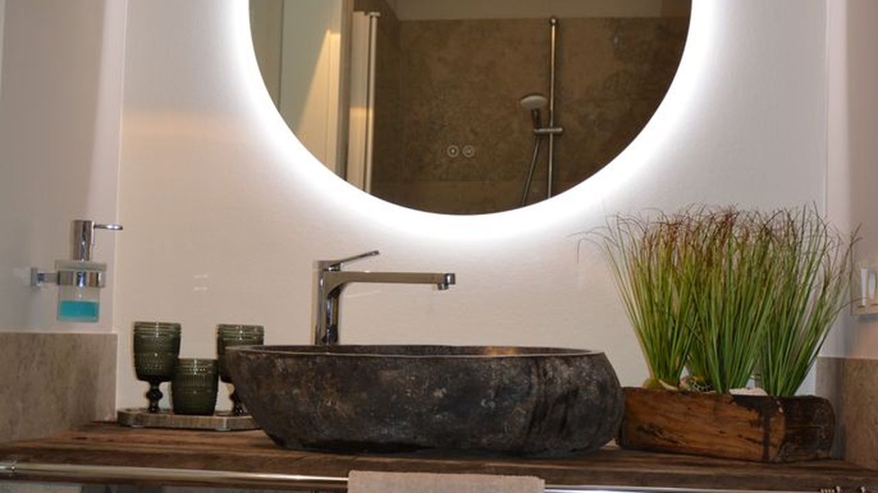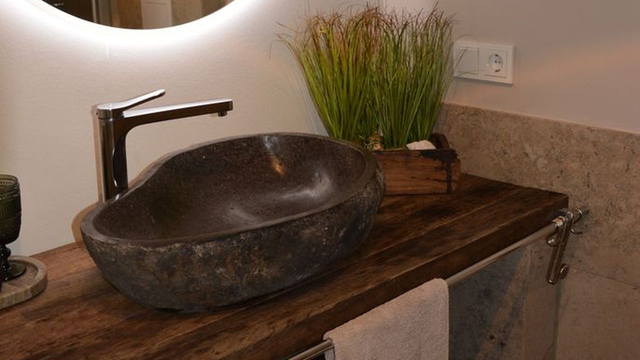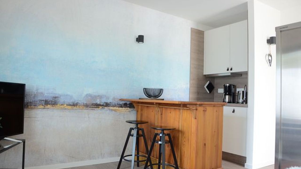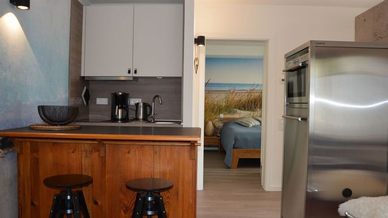 Die Ferienwohnung im Erdgeschoss, ist barrierefrei jedoch über zwei Stufen zu erreichen, für zwei Personen, verfügt über einen Wohn-Essbereich mit Theke, Pantry und Edelstahltechnikblock: Backofen / Microwelle / Kühlschrank mit Gefrierfach, ein Natursteinduschbad bodengleich und einen kleinen Abstellbereich mit Waschtrockner, Wohn- und Schlafraum sind jeweils mit TV ausgestattet. Der Wohnbereich beinhaltet auch ein Schlafsofa.Sonstiges