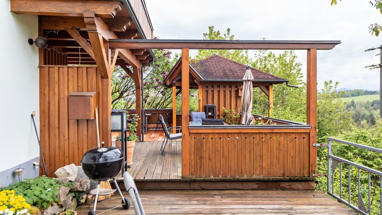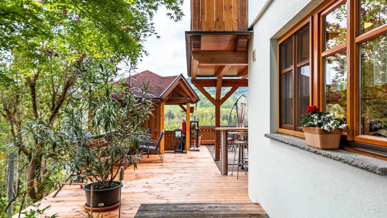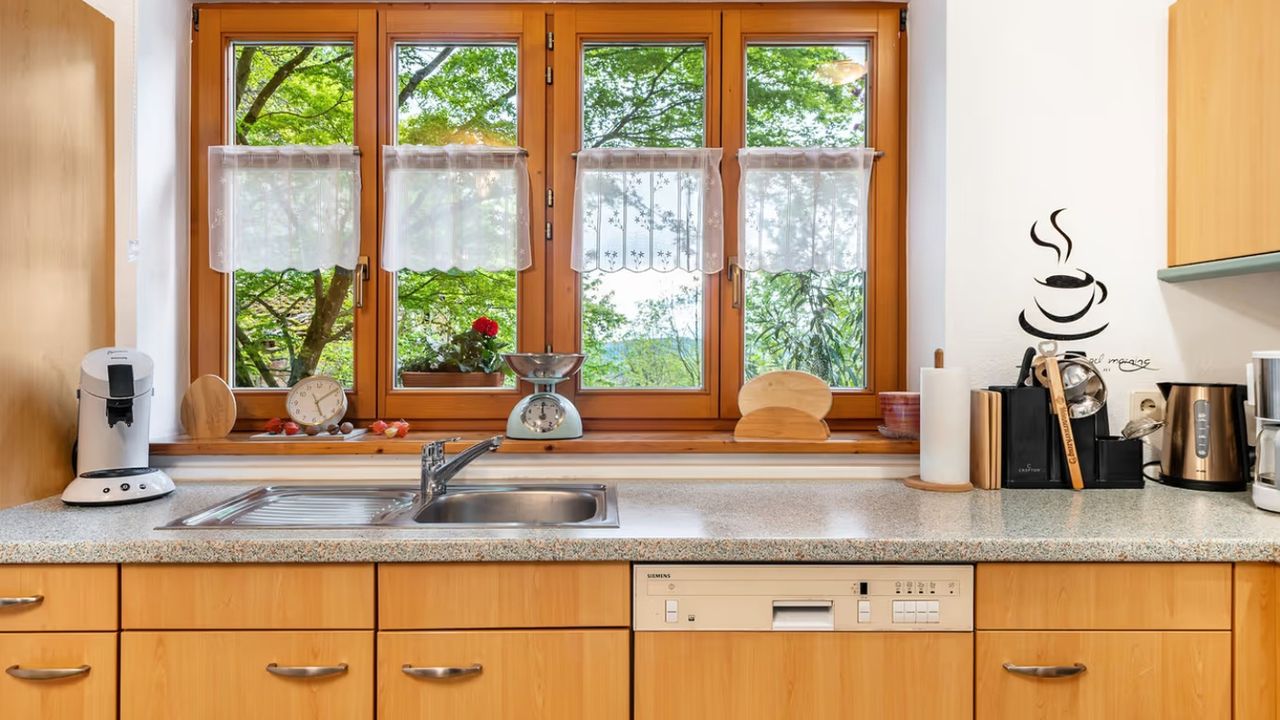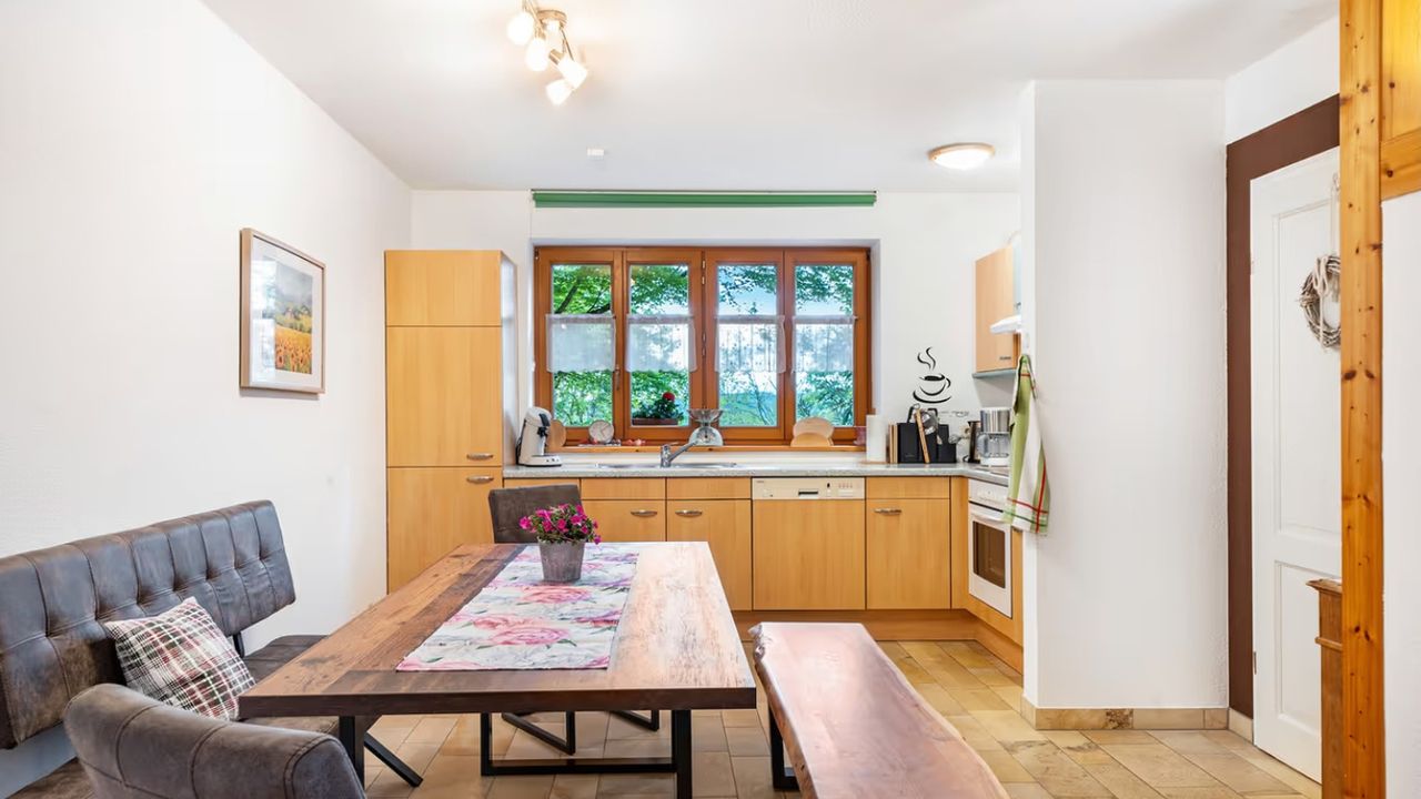 Richtige Urlaubsstimmung kommt auf der schönen Terrasse der Ferienwohnung auf. Die gut ausgestattete Küche besitzt unter anderem einen Kühlschrank, einen Herd zum Kochen und sogar eine Spülmaschine.