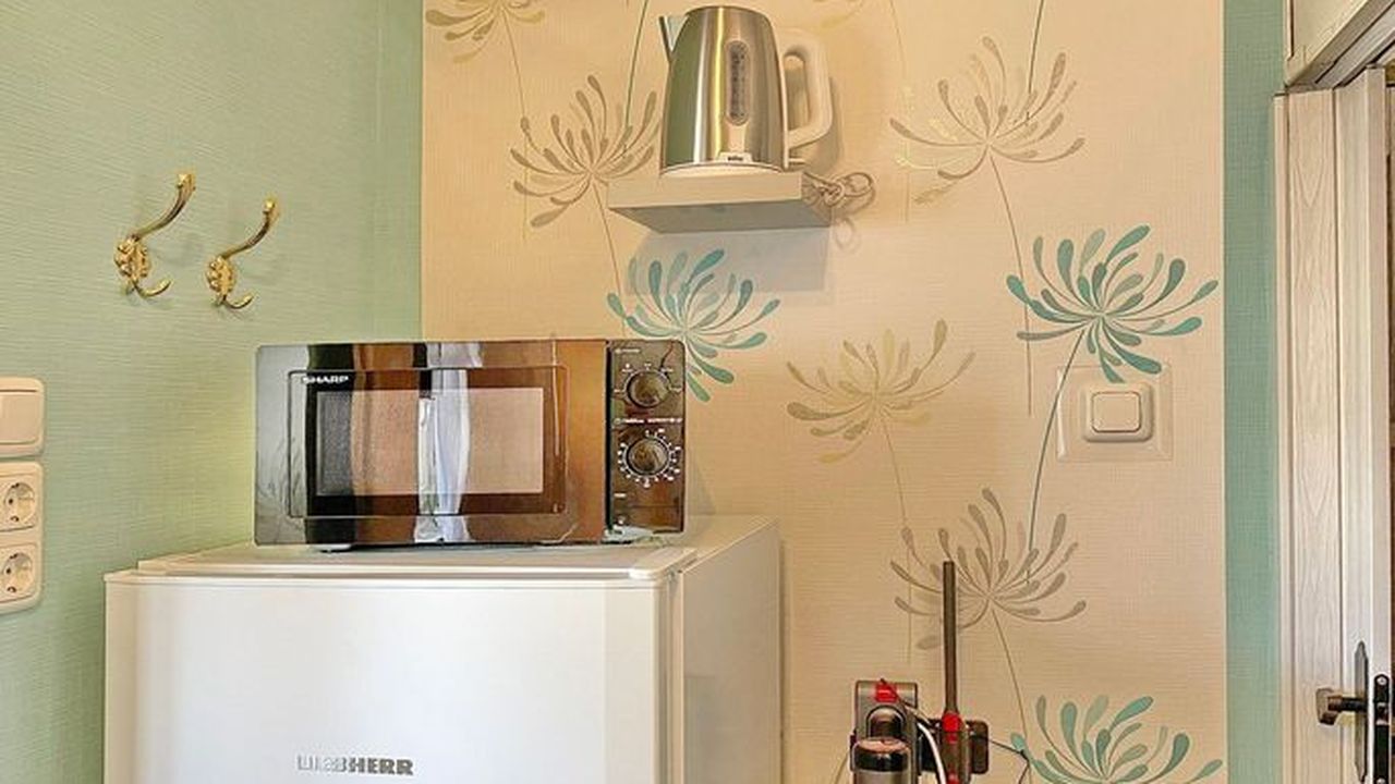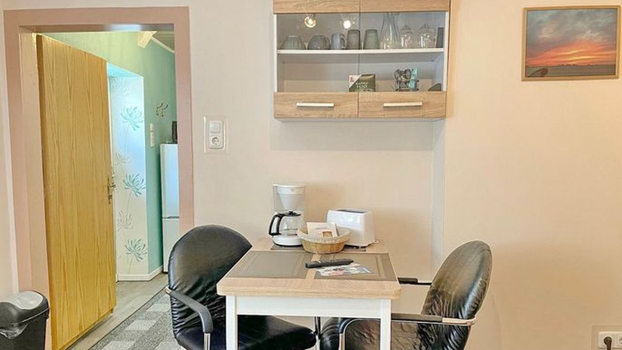 Das Zimmer ist mit einem Kühlschrank, Gefrierfach, Wasserkocher und Mikrowelle ausgestattet. Am kleinen Esstisch können tägliche Mahlzeiten eingenommen werden, so wie Brotmahlzeiten oder ähnlich schnell zubereitete Gerichte. Der Kleiderschrank bietet ausreichend Stauraum für Kleidung, auch für längere Aufenthalte.