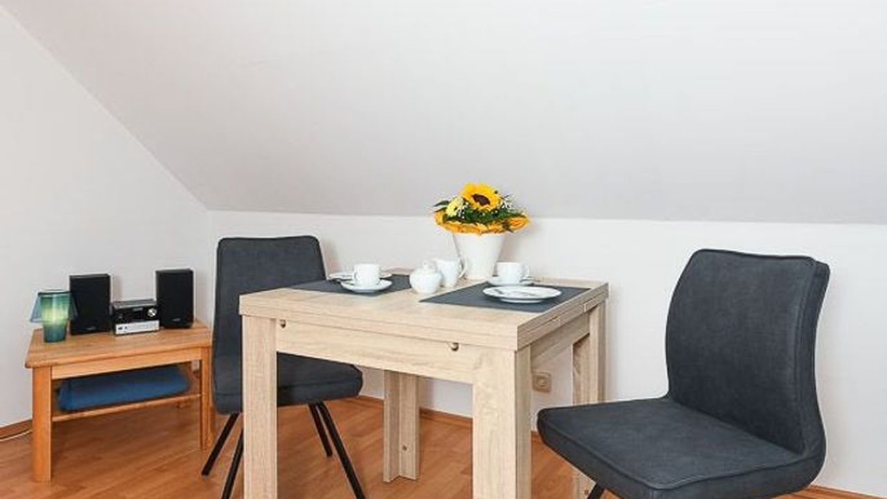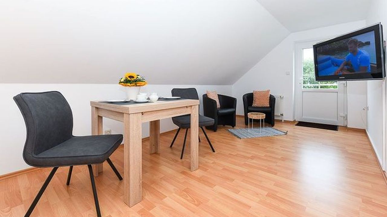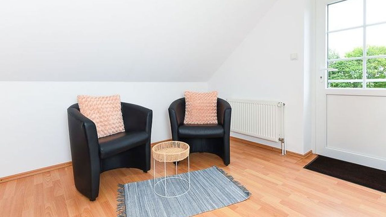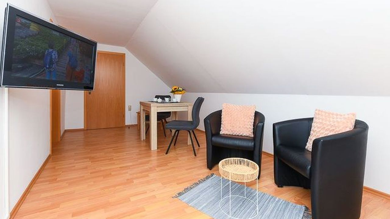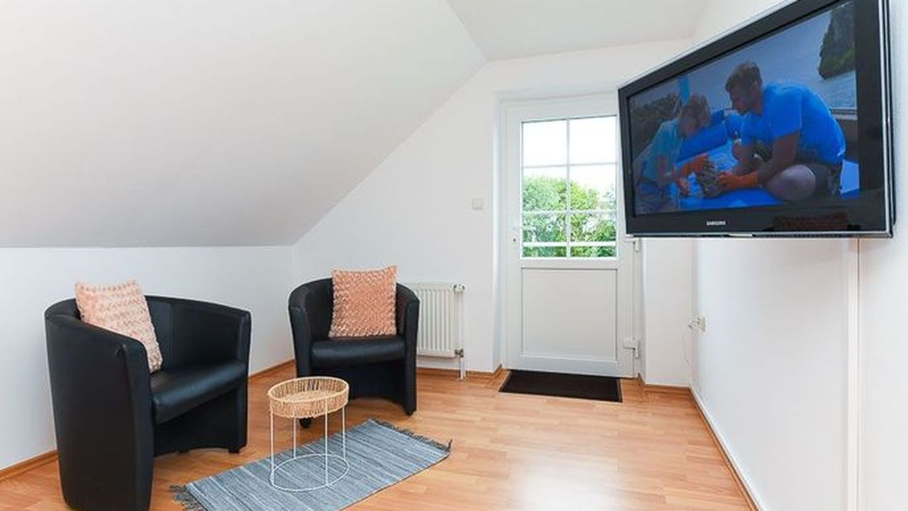 Größe ca. 40 Quadratmeter, Wohnzimmer, Küche, Schlafzimmer, Badezimmer mit Dusche, Waschtisch und WC, Obergeschoss, Terrasse am Haus, Parkplatz am Haus, optimal für 1 bis 2 Personen.Den separaten Eingang zur Ferienwohnung „Dobbe“ erreichen Sie über eine Außentreppe.