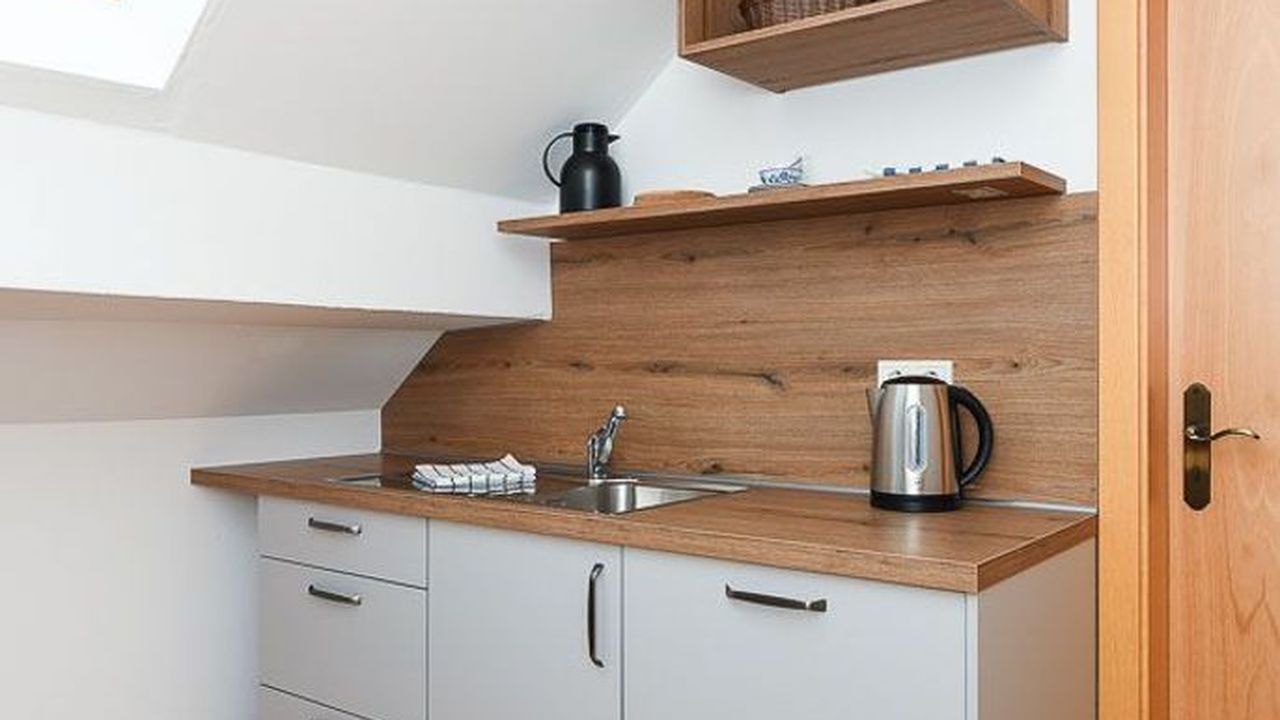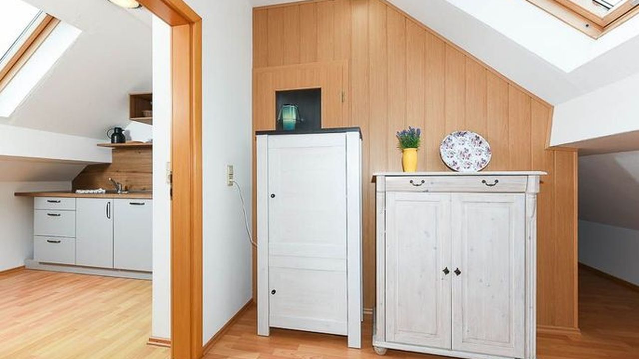 Größe ca. 40 Quadratmeter, Wohnzimmer, Küche, Schlafzimmer, Badezimmer mit Dusche, Waschtisch und WC, Obergeschoss, Terrasse am Haus, Parkplatz am Haus, optimal für 1 bis 2 Personen.