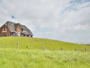 Von der großen Sonnenterrasse hat man einen einmaligen Blick über das umliegende Wattemeer nach Nordstrand, Pellworm, Hallig Hooge, Amrum und über die Südspitze der Insel Sylt bis nach Föhr .