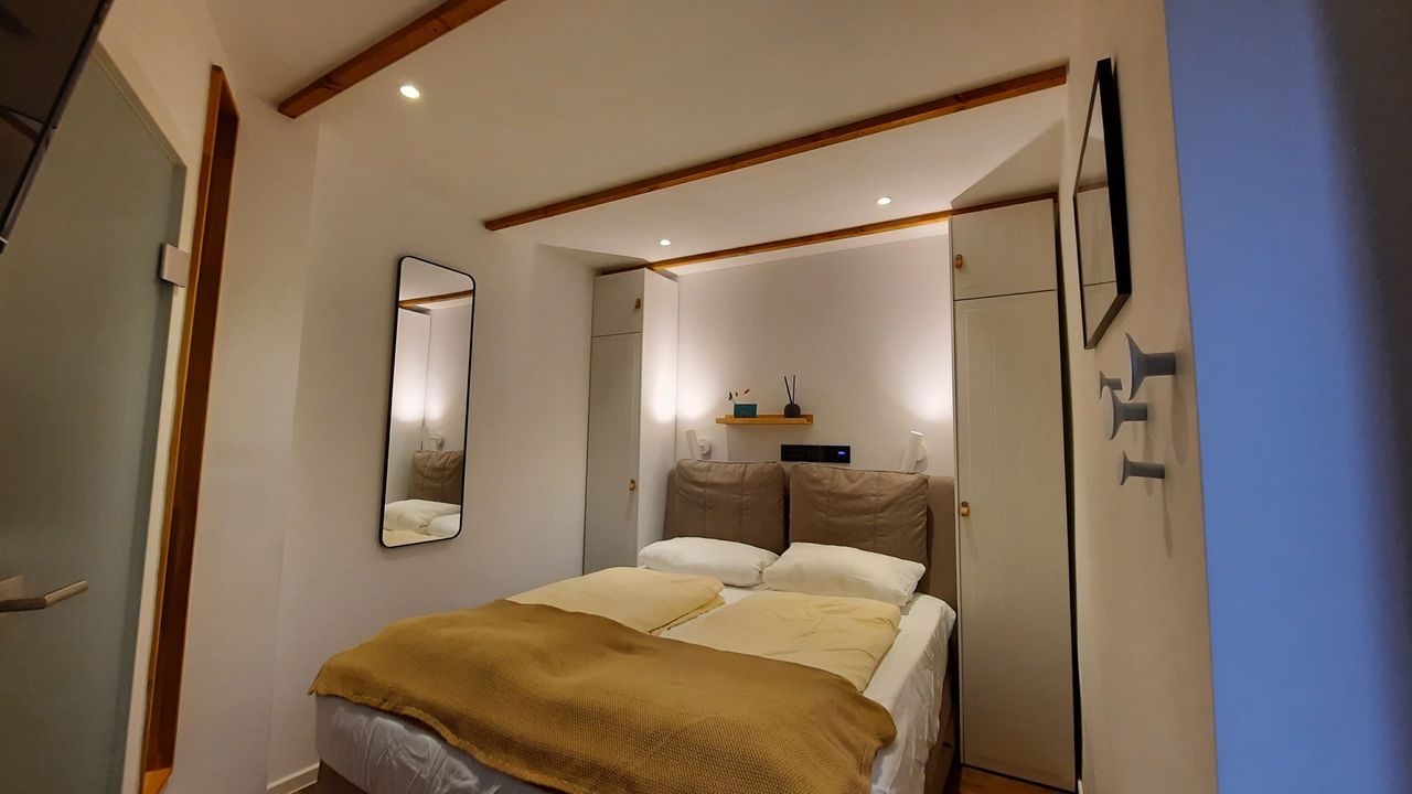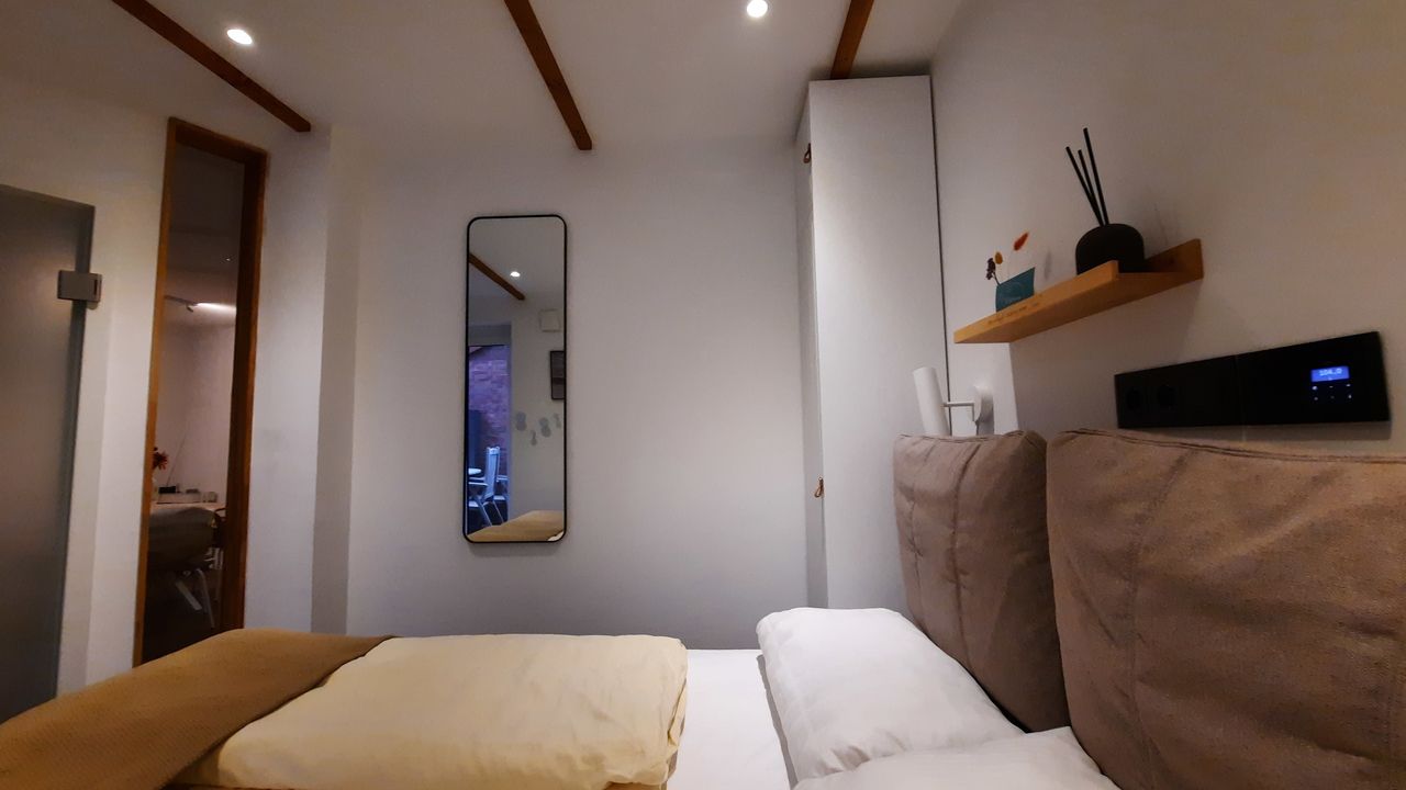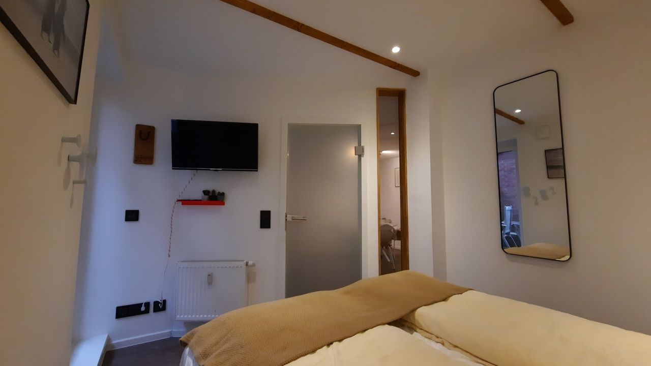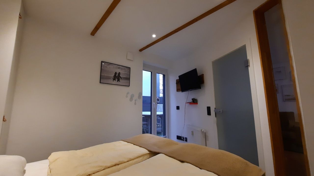 Das Schlafzimmer verfügt über ein Boxspringbrett in der Größe 1,60 m x 2,00 m und zwei Kleiderschränken. Vom Bett aus kann man bequem den Smart-TV inkl. Sonos-Soundbar an der gegenüberliegenden Wand nutzen. Das bodentiefe Fenster lässt sich komplett öffnen und führt zur Terrasse.