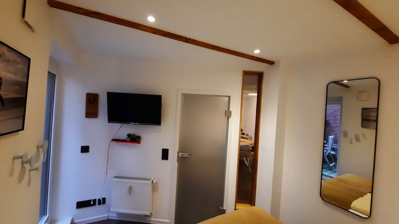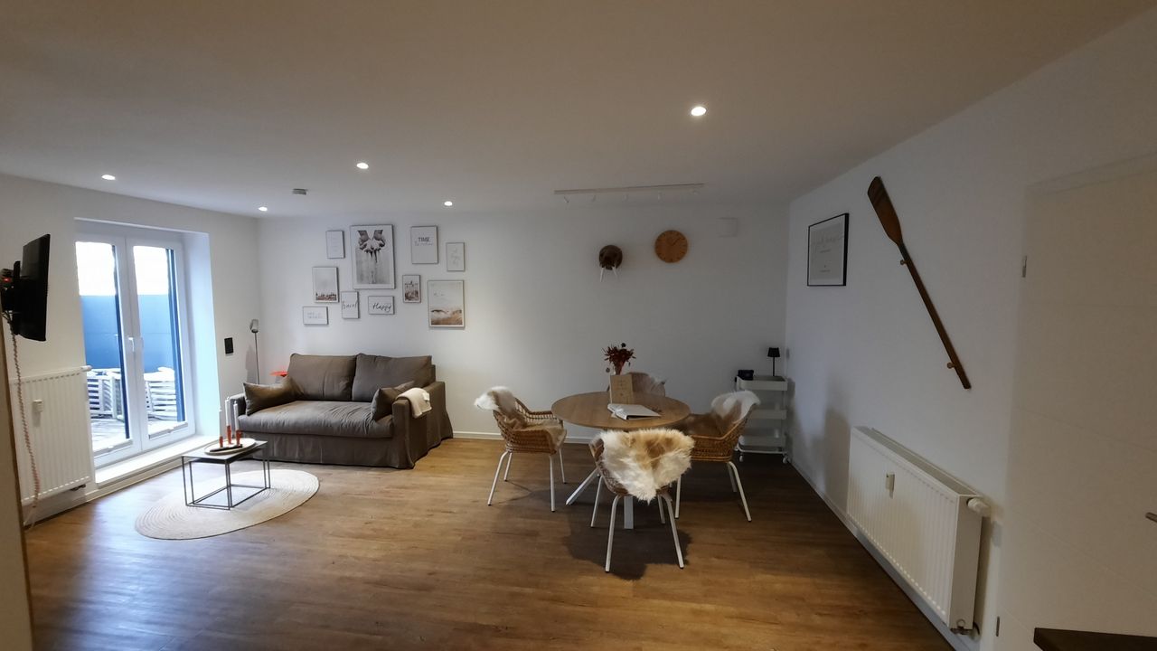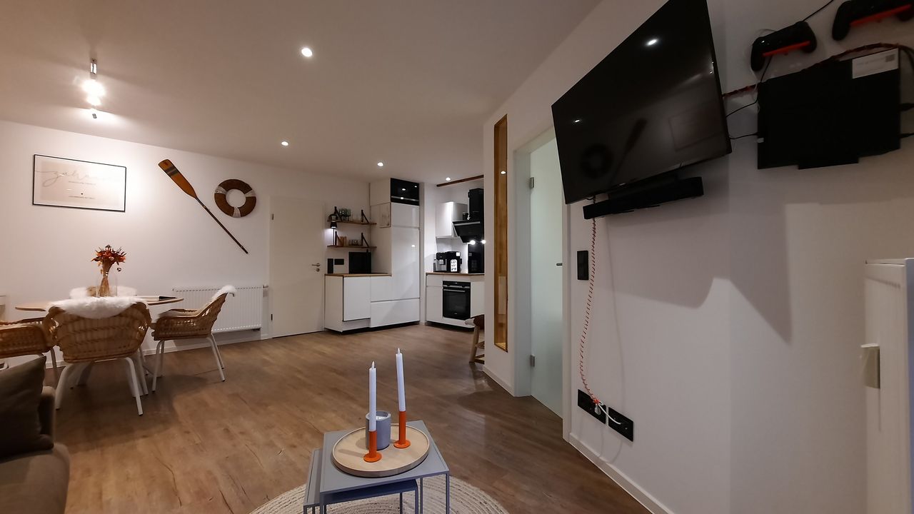Die Schlafcouch lässt sich nach "vorne" ausziehen, wo durch eine Liegefläche von 1,40 m x 2,00 m entsteht und somit von zwei Personen als Schlafmöglichkeit genutzt werden kann. Der 43 Zoll QLED große Smart-TV inklusive Sonos-Surroundanlage lädt zum Verweilen ein. Ebenso steht eine Playstation 4 mit diversen Spielen zur Verfügung.