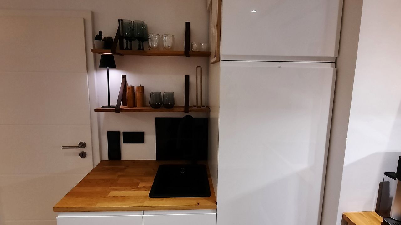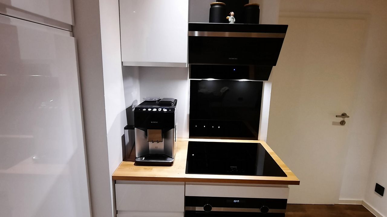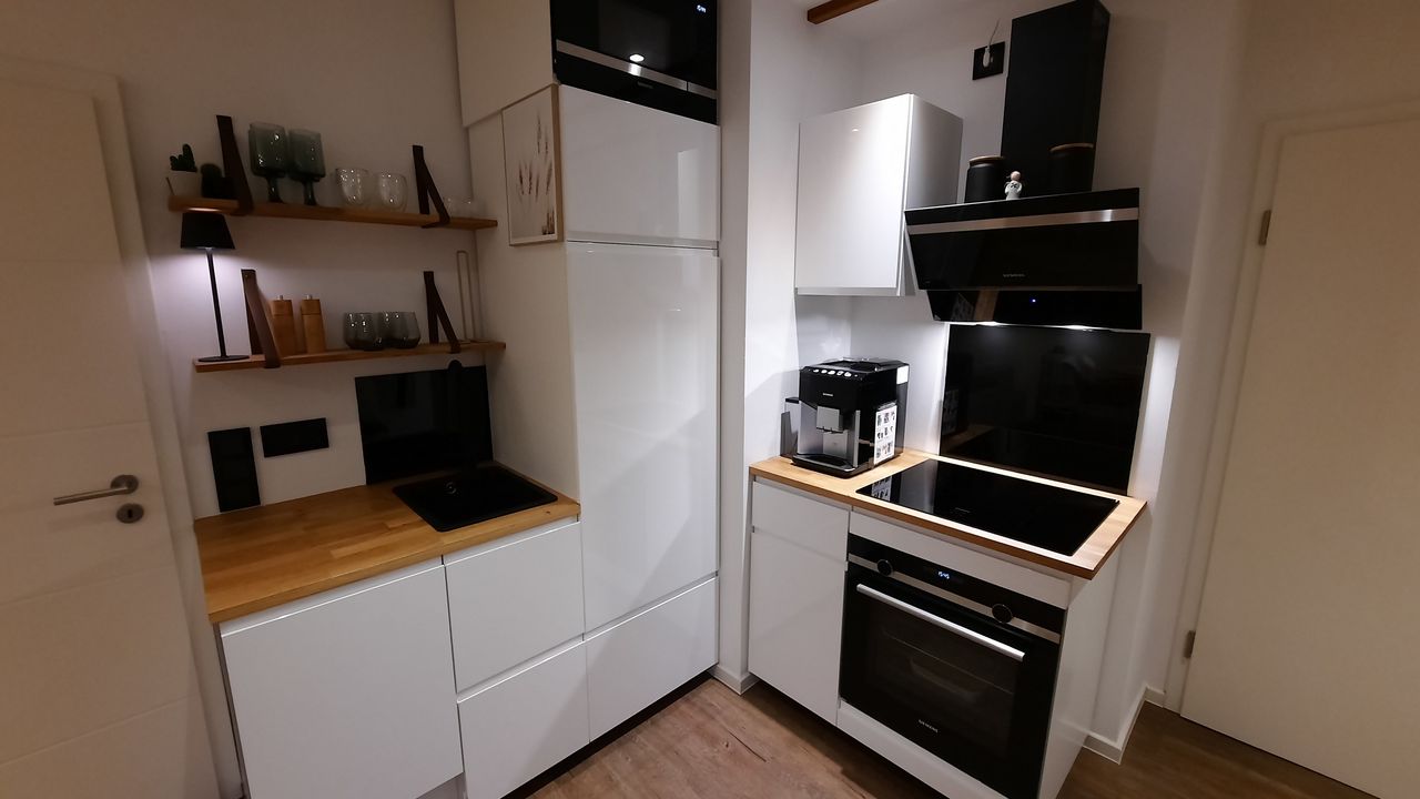 Die Küche ist mit allen nötigen Utensilien wie Kühlschrank inkl. Gefrierfach, Induktionskochfeld, Geschirrspülmaschine, Dunstabzugshaube, Mikrowelle, Wasserkocher, Waffeleisen, elektrischer Stabmixer, Toaster, Kaffeevollautomat, Backofen etc. ausgestattet. Geräte sind von Siemens.