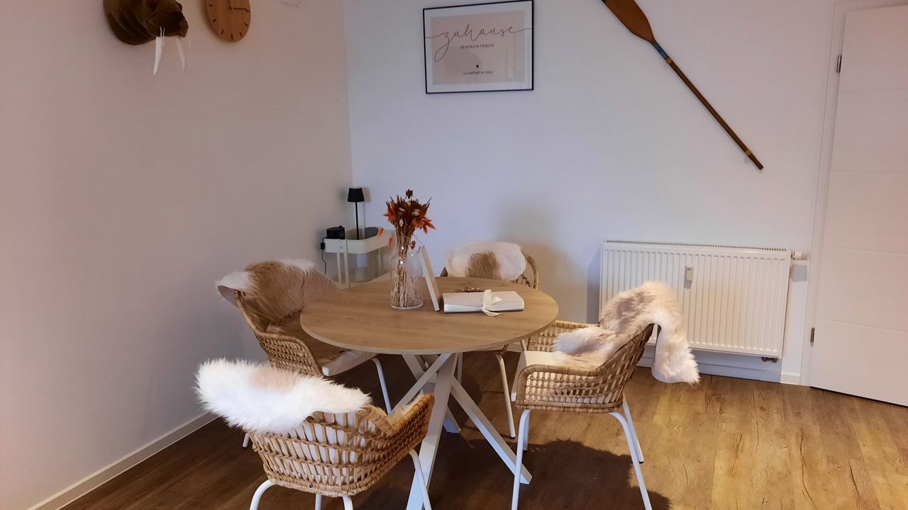 Der Essbereich besteht aus einem im Durchmesser 105 cm runden Tisch mit vier Stühlen.