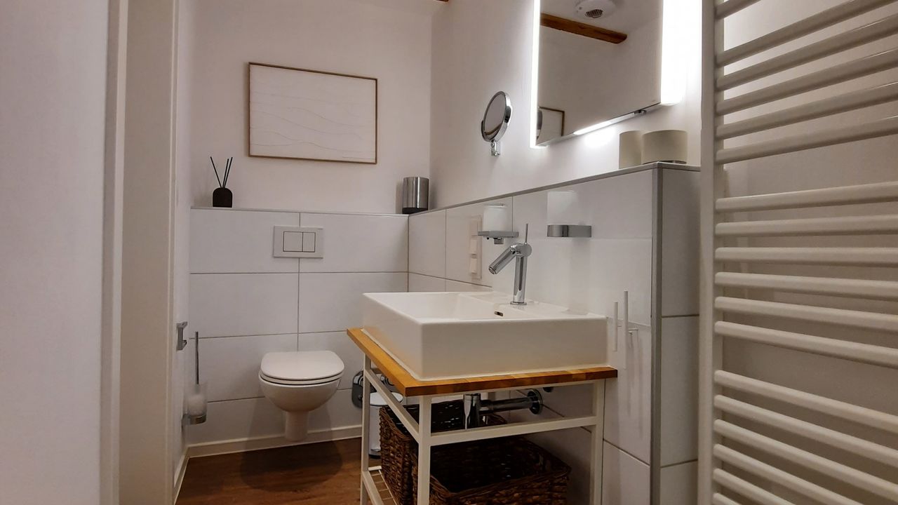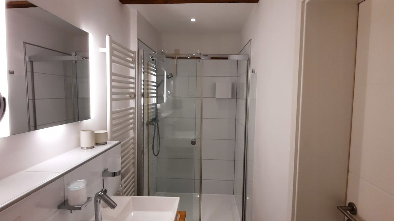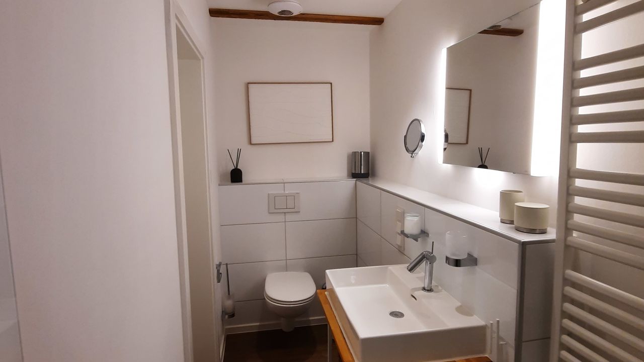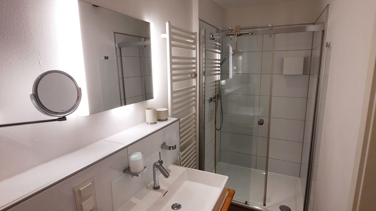 Das Bad mit seiner bodentiefen Dusche wurde mit Gegenständen von Keuco ausgestattet. Der hochwertige Wandspiegel lässt sich beleuchten (und dimmen).