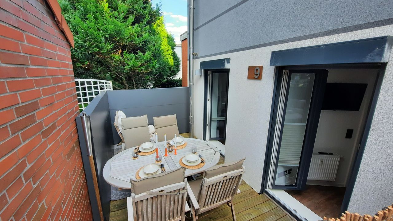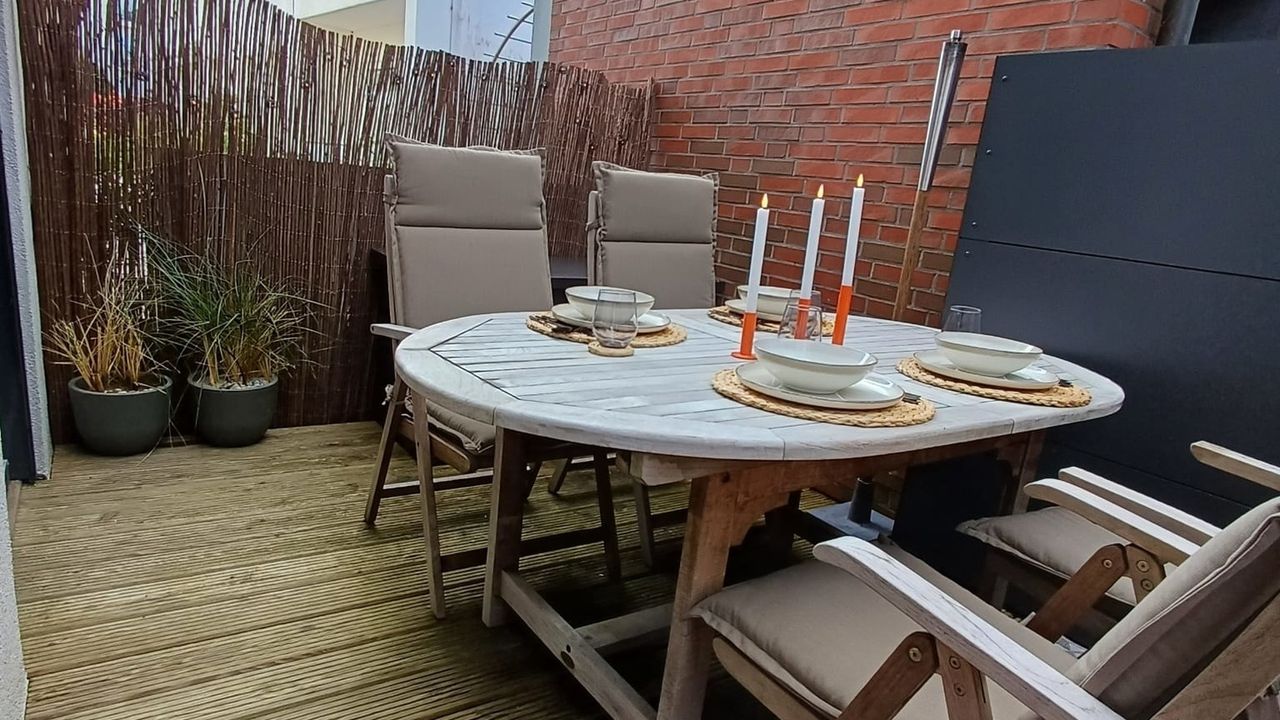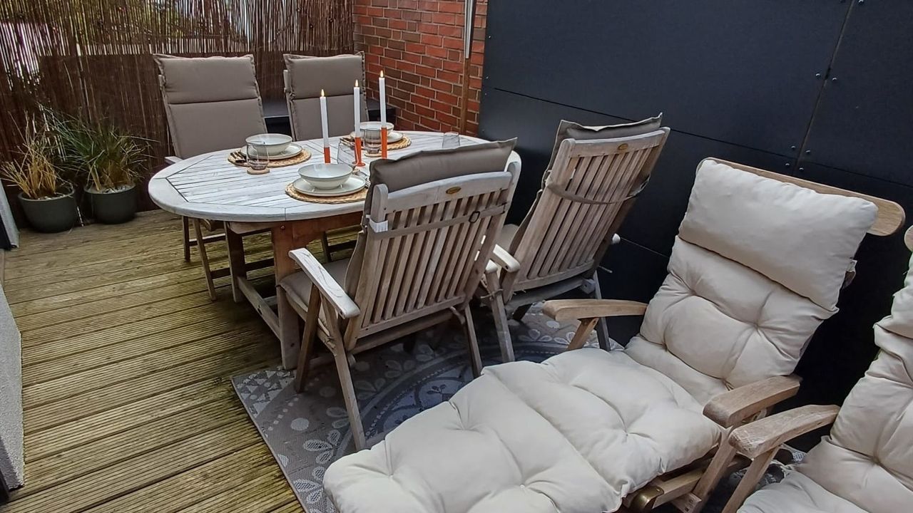 Die uneinsichtige und allein zur Wohnung gehörende Terrasse verfügt über einen Tisch mit vier Stühlen sowie zwei Deckchairs jeweils aus Teakholz und mit Auflage. Die Auflagen lassen sich bequem in der Biohort-Box unterbringen. Hier finden Sie auch einen Wäscheständer.