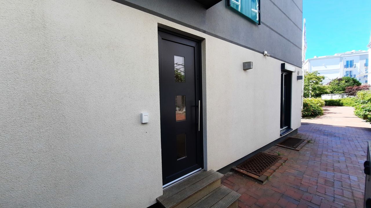 Die Wohnung befindet sich auf der abgewandten Straßenseite der Kirchstraße ("Hofseite"). Die Kirchstraße selbst zeichnet sich durch eine ruhige, aber dennoch sehr zentrale Lage aus. Der Weststrand ist ca. 240 m entfernt, der Kurplatz mit dem angrenzenden Badehaus ist in ca. 350 m zu erreichen.
