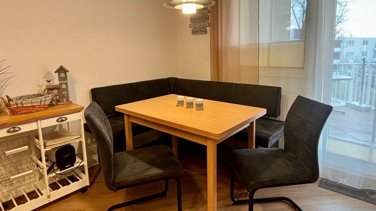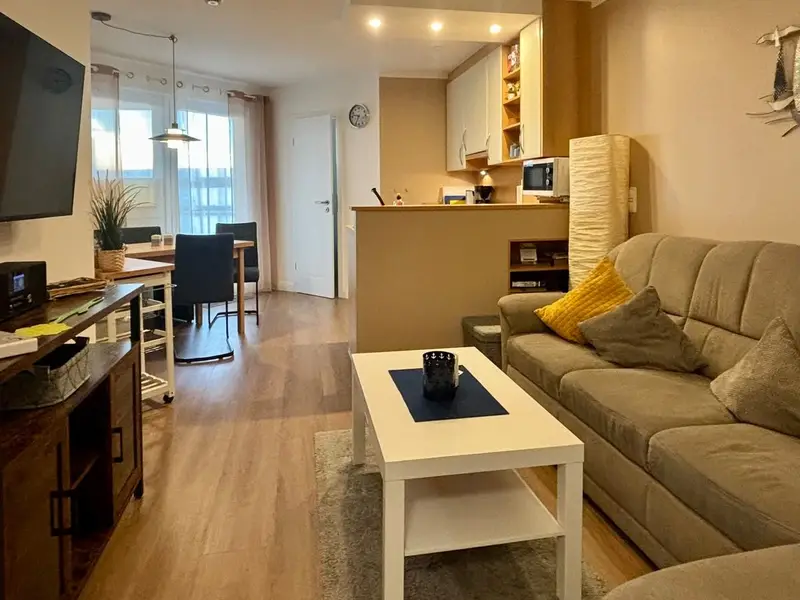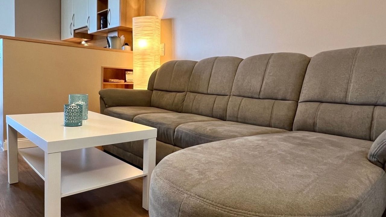 Der gemütliche Wohn- und Essbereich bildet das Herzstück der Ferienwohnung. Hier lässt sich´s abends einen gemütlichen Fernsehabend (Smart TV) auf dem Sofa verbringen und wenn Sie zu Fünft anreisen, lässt sich das Sofa ganz einfach zum Bett umfunktionieren (140cm x 180 cm).
