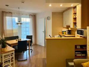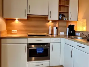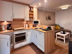 Die offen gestaltete Küche verfügt über alles nötige für Ihren Aufenthalt. Spülmaschine, Mikrowelle und Backofen sind vorhanden. Der Kühlschrank verfügt über ein Eisfach und neben einer Filterkaffeemaschine steht Ihnen auch eine Nespressomaschine zur Verfügung (Kapseln nicht inklusive).