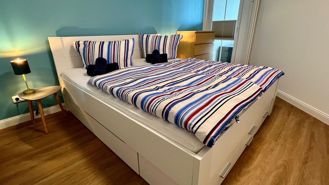 Vom Flur aus gelangen Sie in das gemütliche Schlafzimmer mit Doppelbett (2x 90x200 cm) und einem großzügigen Kleiderschrank für Ihre Urlaubsgarderobe, sowie einem Fernseher.