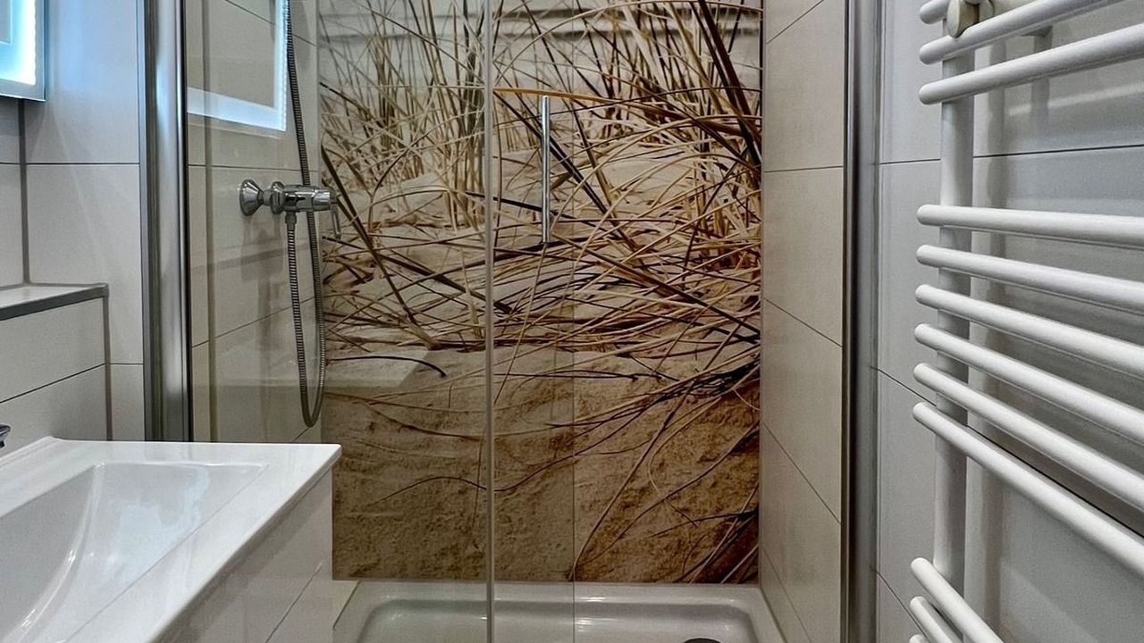 Das moderne Duschbad weckt direkt die ersten Urlaubsgefühle und ist mit einer Dusche, Waschbecken und Föhn ausgestattet. Das WC befindet sich separat.