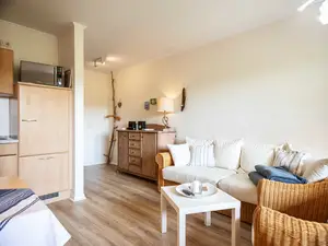 Ost-Balkon mit Fernblick in den Garten, über das Feld bis hin zum Wald.Wenn morgens im Osten die Sonne aufgeht, dann kann das Wild vom Balkon auf dem Feld beobachtet werden. Die Ferienwohnung 07 "Treibgut" hat eine Küche, ein Schlafzimmer mit einem Doppelbett. Die Küche ist voll ausgestattet.