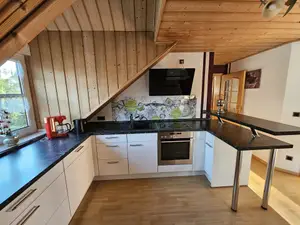 Die gut ausgestattete Küche besitzt unter anderem einen Kühlschrank, einen Herd zum Kochen und sogar eine Spülmaschine.