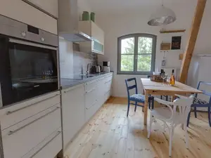 Der offene und helle Wohnbereich mit zwei französischen Balkonen zum Garten inkl. Haffblick ist mit einem Kamin, Wohnsitzecke, Esstisch und einer großen Küche ausgestattet. In der Küche finden Sie einen Backofen, ein Kochfeld, einen Kühlschrank mit Gefrierfach, einen Geschirrspülautomaten, Kaffeemaschine, Toaster und Wasserkocher für ein uneingeschränktes Kochvergnügen.