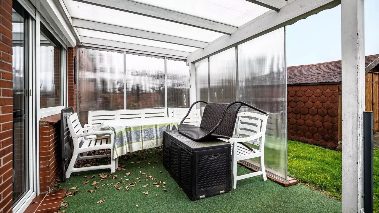 Das Ferienhaus verfügt über einen privaten Außenbereich mit Garten und einer überdachten Terrasse.