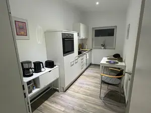 Die Küche in der Ferienwohnung ist mit allen Geräten Ausgestattet, Wasserkocher, Kaffeemaschiene usw.