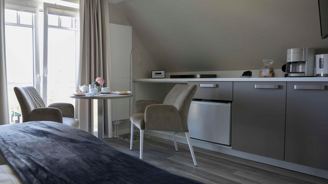 Es ist mit einem komfortablen Boxspring-Doppelbett, einem neuen Flachbild-TV mit Kabelfernsehen, einem Radio/CD-Player, eigenem WLAN und einem kleinen Kühlschrank ausgestattet. Außerdem haben Sie die Möglichkeit, sich Tee oder Kaffee zuzubereiten. Die geschmackvolle und elegante Einrichtung schafft eine angenehme Urlaubsatmosphäre.