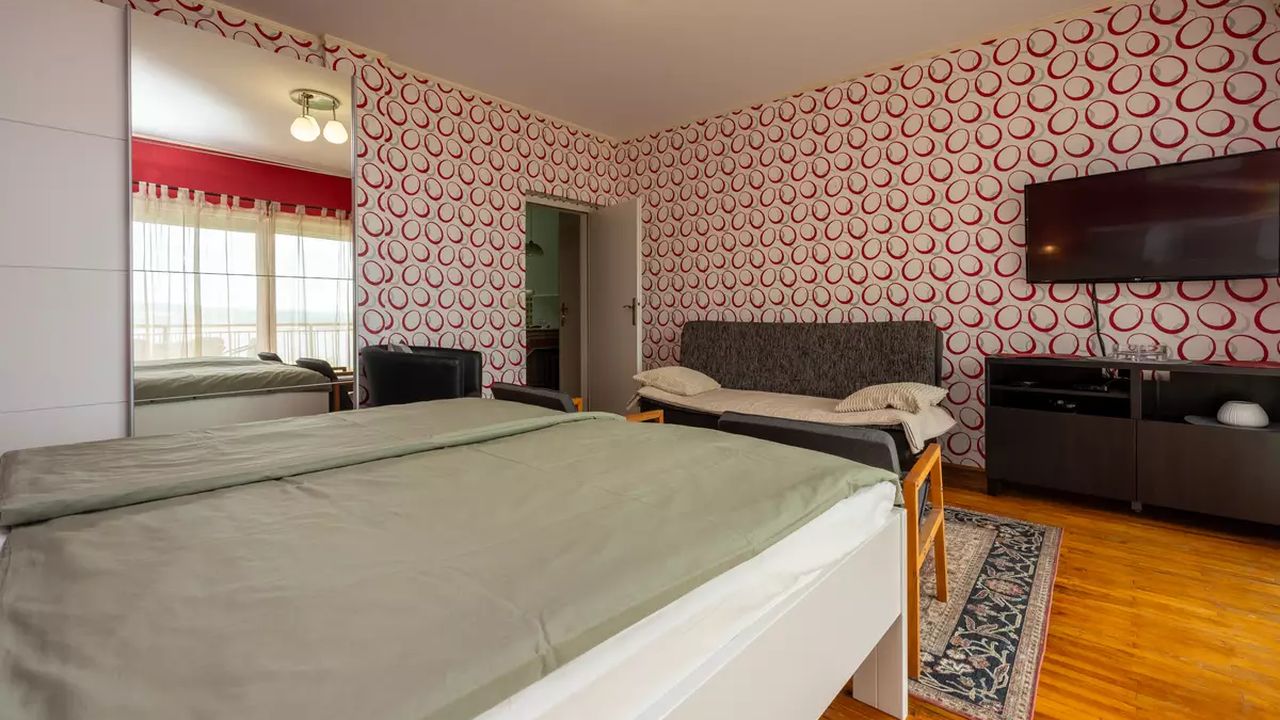 Doppelzimmer mit Doppelbett, Schlafcouch f and uuml;r eine Person, Terrasse, Meerblick, Parkett