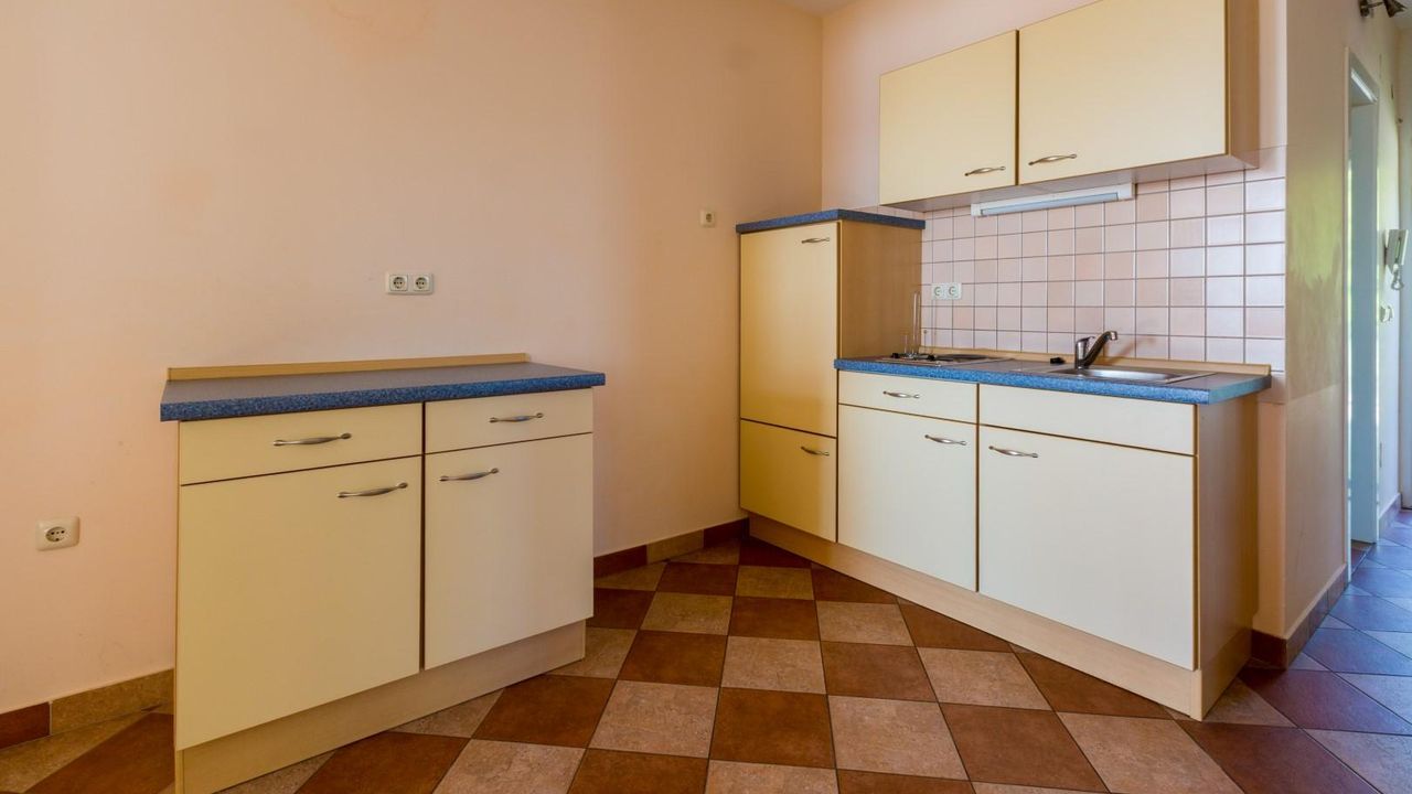 Wohn/Esszimmer und K and uuml;che sind ein Raum, Schlafcouch f and uuml;r 1 Person, Terrasse, Fliesen, Sat-TV