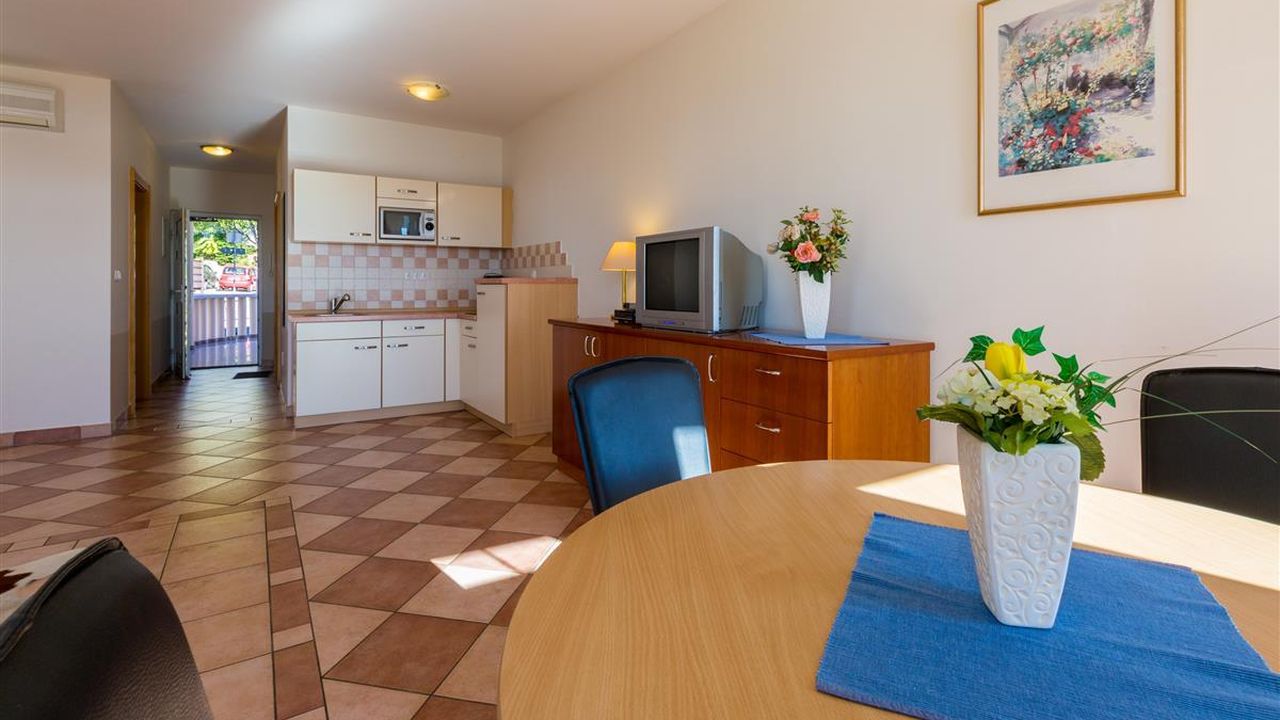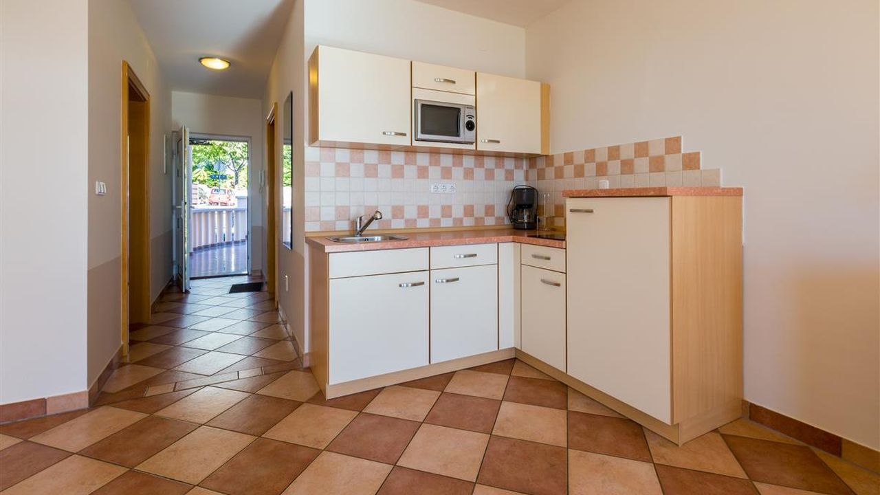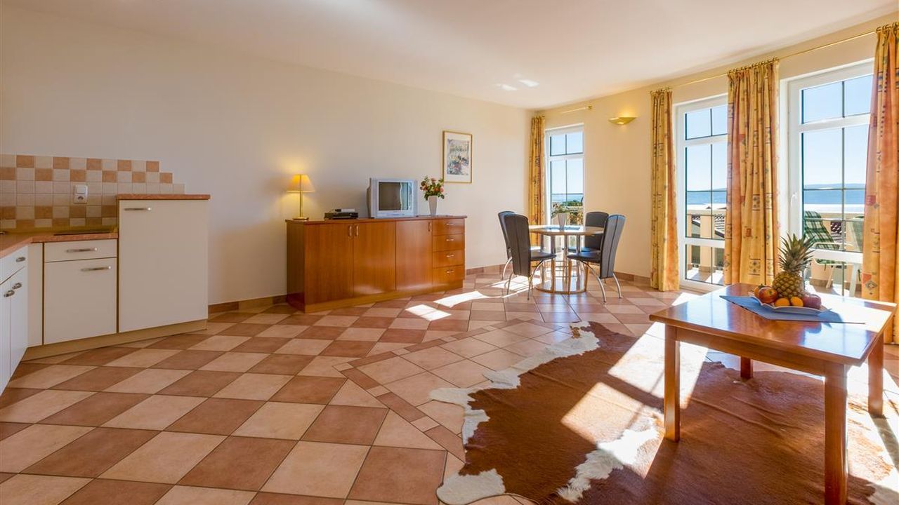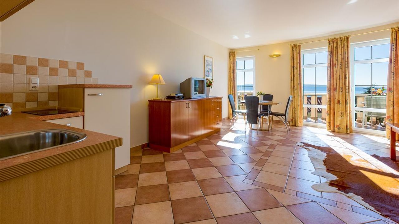 Wohn/Esszimmer und K and uuml;che sind ein Raum, Schlafcouch f and uuml;r zwei Personen, Terrasse, Fliesen, Sat-TV
