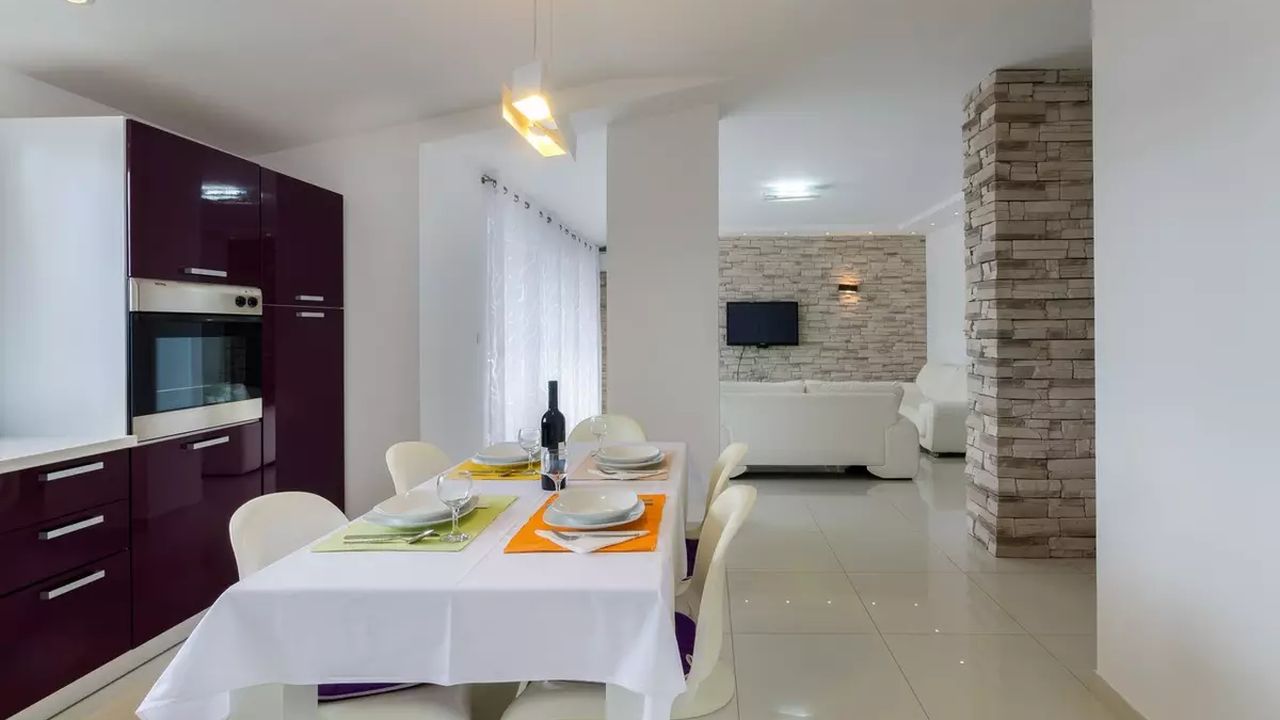 Nicht weit vom Sandstrand in Crikvenica befindet sich diese Ferienwohnung. Im untergeschoss dieses Hauses ist ein kleiner Supermarkt in dem man f and uuml;r die erste Hand alles kaufen kann.Diese Ferienwohnung ist sehr geschmackvoll und luxuri and ouml;s eingerichtet. Der Balkon der Ferienwohnung, sowie das Wohnzimmer bieten einen traumhaften Meerblick.