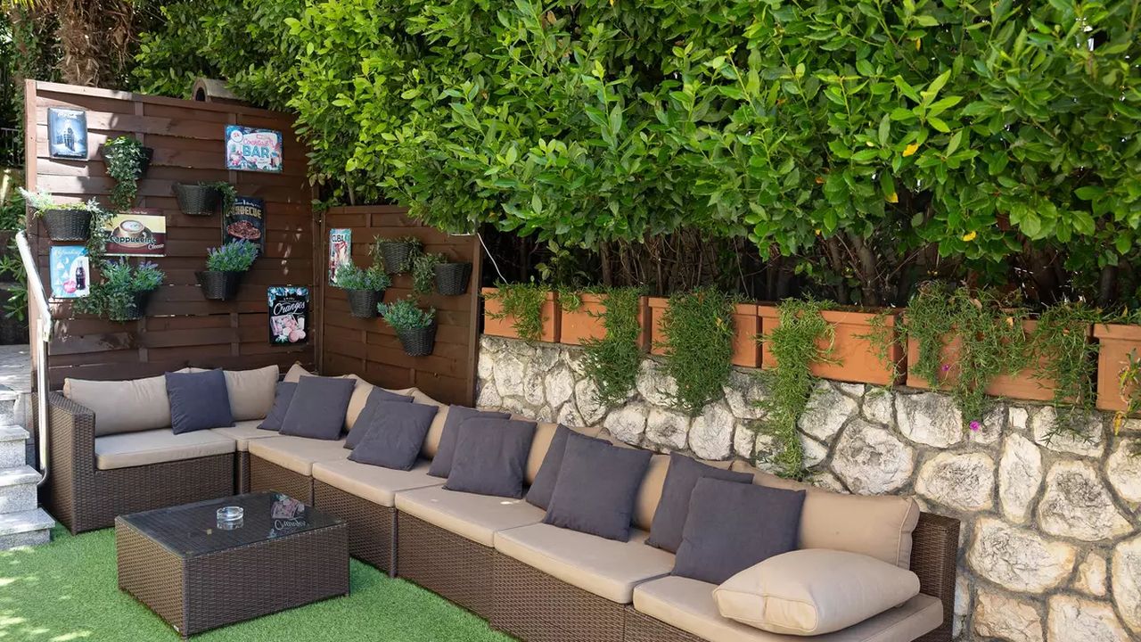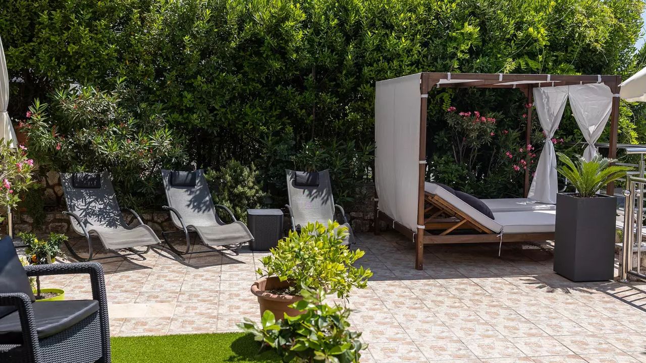 eigene Terrasse, gemeinsame Terrasse, and uuml;berdacht, Bestuhlung, Liegen, Sonnenschirm, Terrassengr and ouml; and szlig;e: 15 m and sup2;