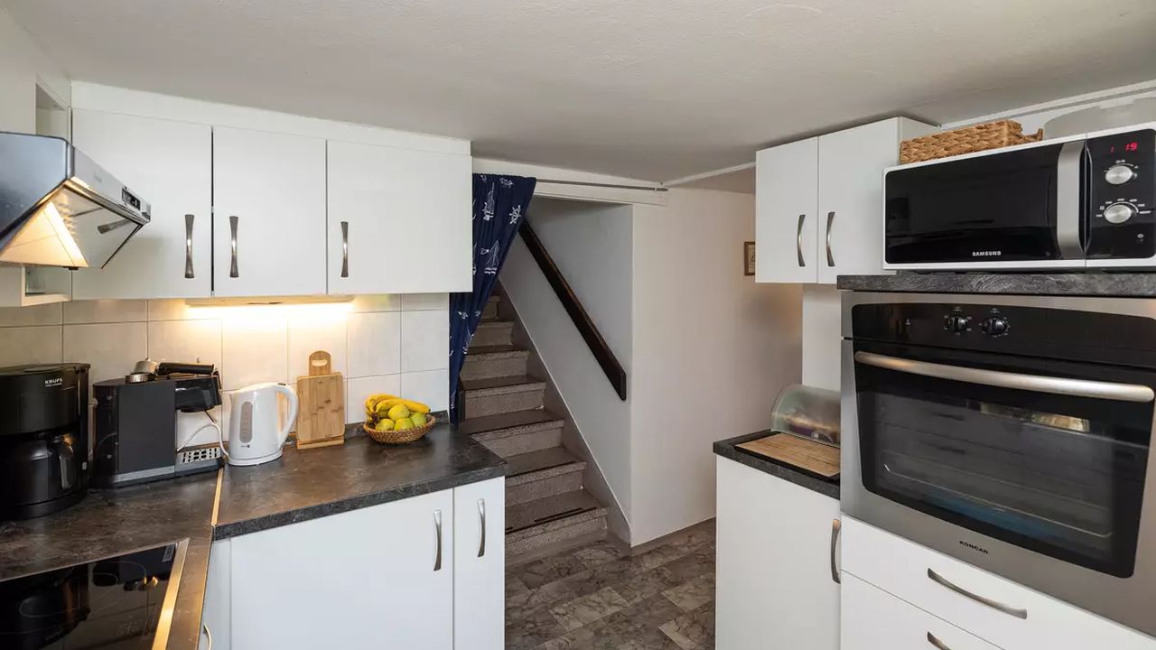 K and uuml;che, Geschirr, K and uuml;chenhandt and uuml;cher, Elektroherd, Kochplatten: 4, Backr and ouml;hre, K and uuml;hlschrank und Tiefk and uuml;hltruhe, Filterkaffeemaschine, Mikrowelle, Geschirrsp and uuml;lmaschine