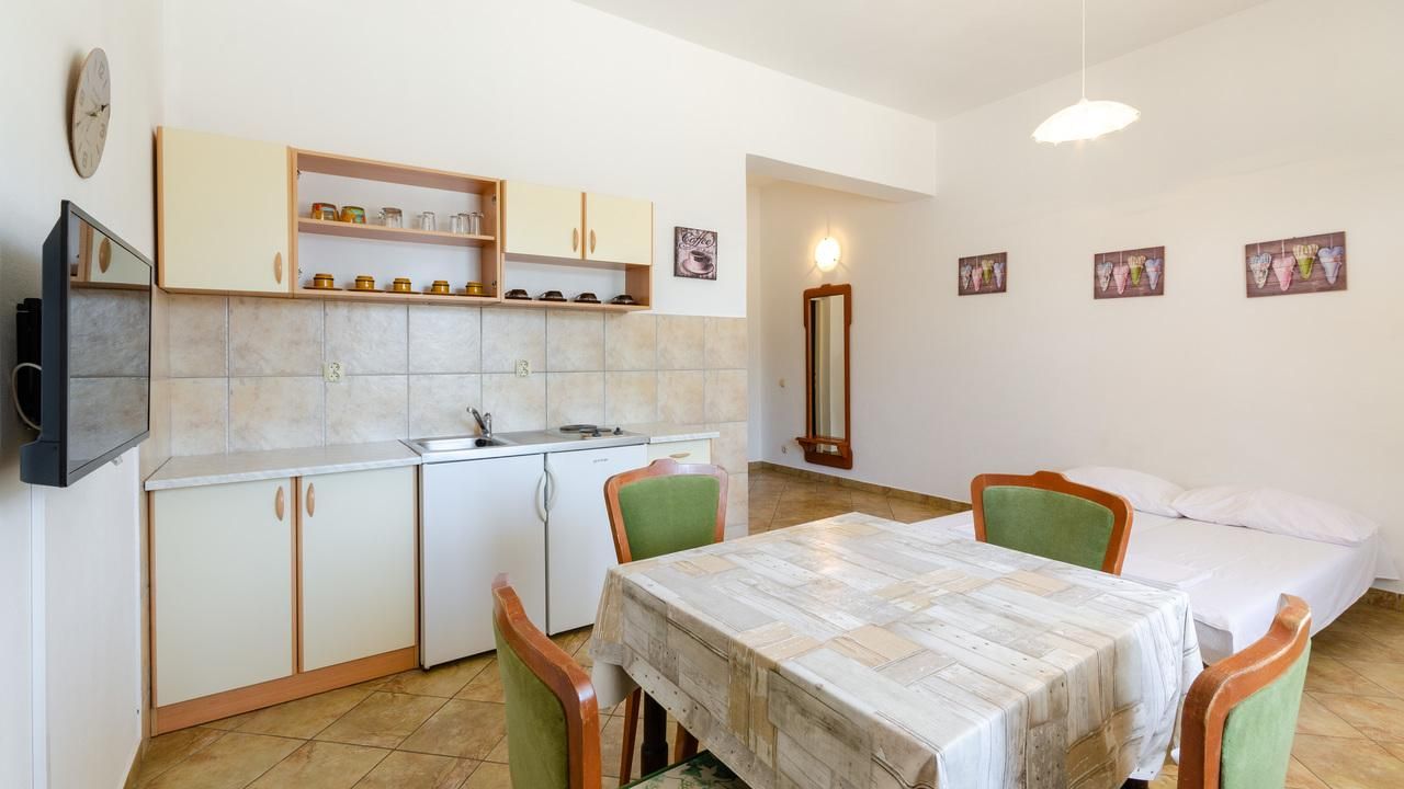 Wohn/Esszimmer und K and uuml;che sind ein Raum, Schlafcouch f and uuml;r zwei Personen, Terrasse, Fliesen, Sat-TV