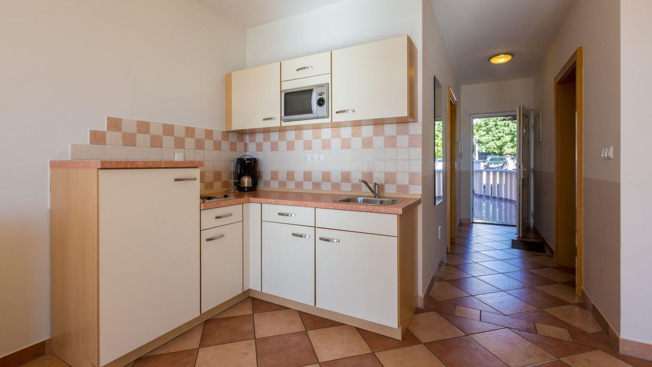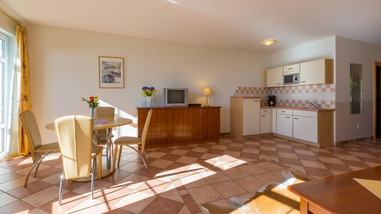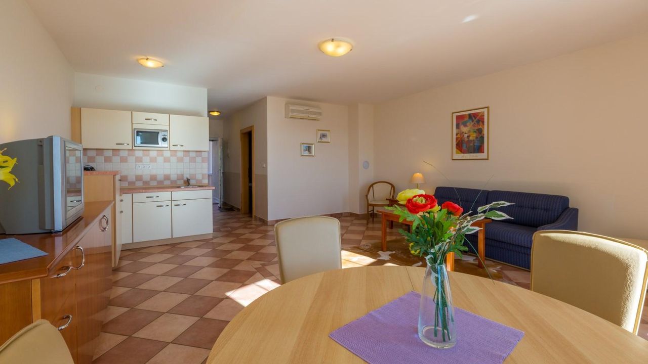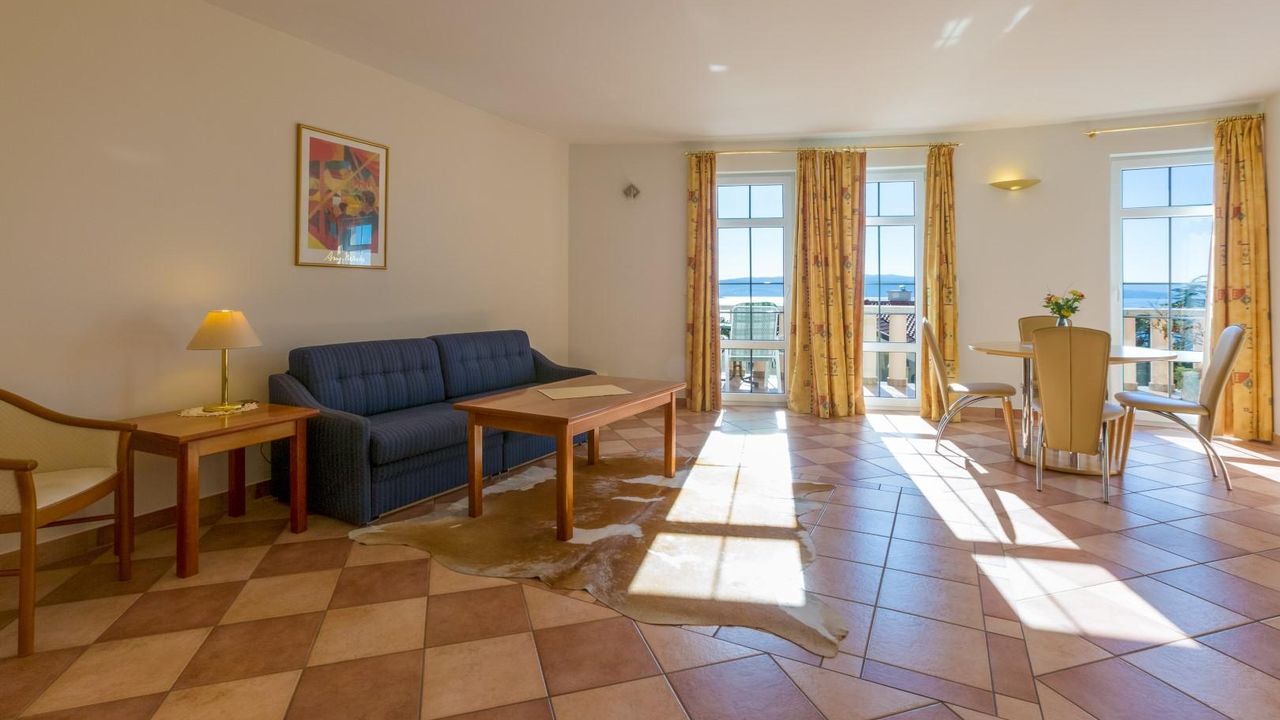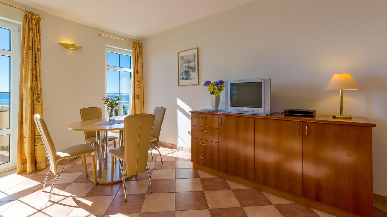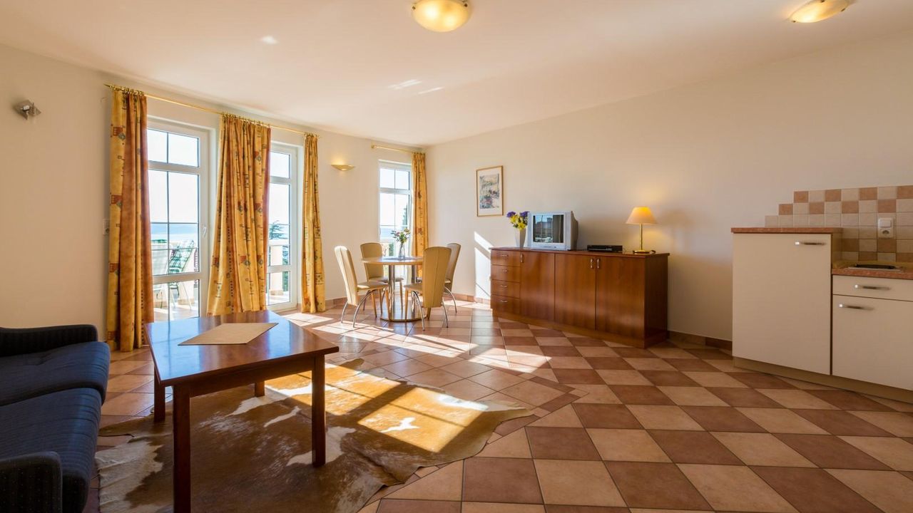 Wohn/Esszimmer und K and uuml;che sind ein Raum, Schlafcouch f and uuml;r zwei Personen, Balkon, Meerblick, Fliesen, Sat-TV