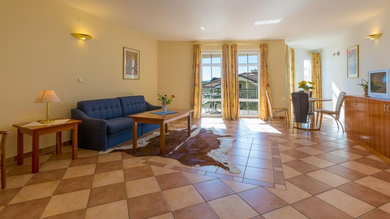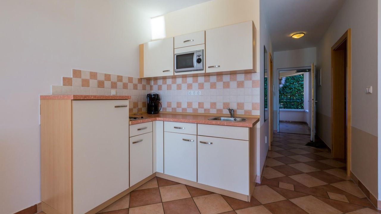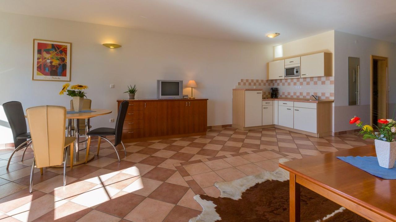 Wohn/Esszimmer und K and uuml;che sind ein Raum, Schlafcouch f and uuml;r zwei Personen, Terrasse, Fliesen, Sat-TV