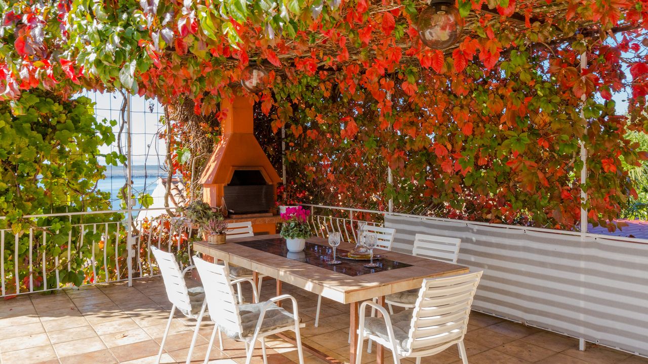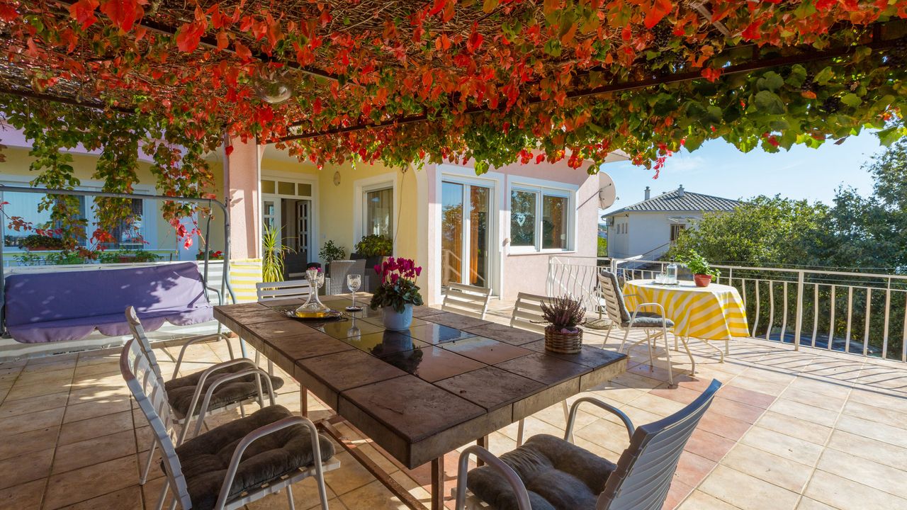 Die 60 m and sup2; grosse Terrasse die teils beschattet ist bietet ein grandiosen Blick auf das Meer.